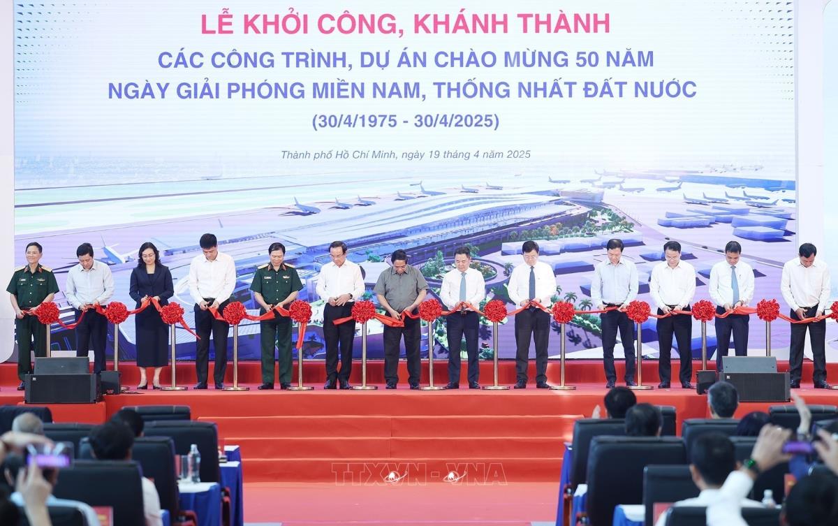 Hà Nội (TTXVN 19/4/2025) Sáng 19/4/2025, tại điểm cầu trung tâm Nhà ga T3 Cảng hàng không quốc tế Tân Sơn Nhất, Thành phố Hồ Chí Minh, Thủ tướng Phạm Minh Chính dự lễ khởi công, khánh thành các công trình, dự án trọng điểm quốc gia và các công trình lớn nhân dịp kỷ niệm 50 năm Ngày Giải phóng miền Nam, thống nhất đất nước (30/4/1975 - 30/4/2025).
