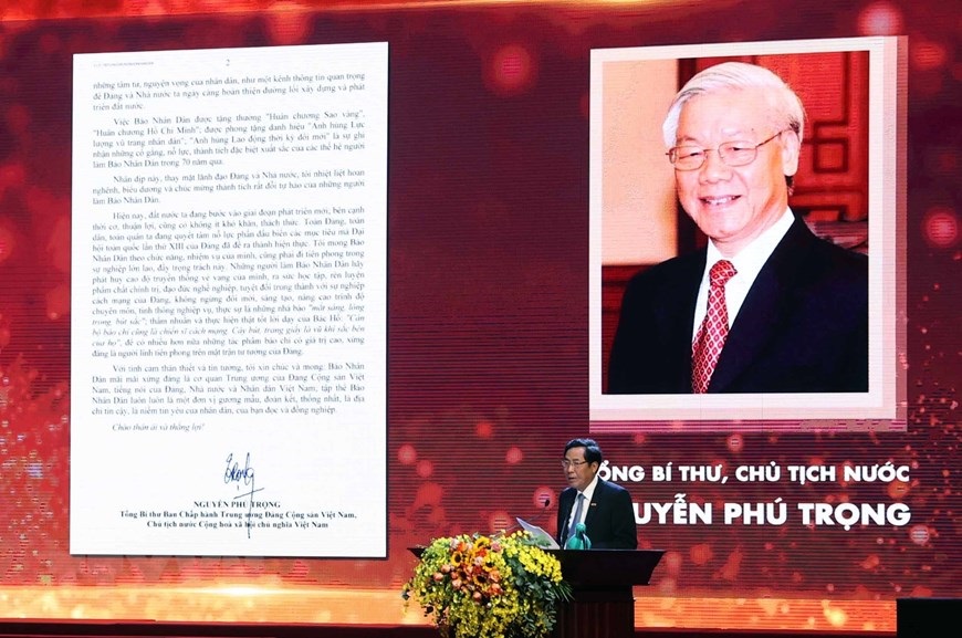 Sáng 11/3/2021 tại Hà Nội, Thủ tướng Nguyễn Xuân Phúc dự Lễ kỷ niệm 70 năm Ngày báo Nhân Dân ra số đầu (11/3/1951-11/3/2021). Thủ tướng Nguyễn Xuân Phúc tới dự Lễ kỷ niệm. (Ảnh: Thống Nhất/TTXVN)Thủ tướng Nguyễn Xuân Phúc cùng các đại biểu thực hiện nghi thức chào cờ. (Ảnh: Thống Nhất/TTXVN)Thủ tướng Nguyễn Xuân Phúc cùng các đại biểu thực hiện nghi thức chào cờ. (Ảnh: Thống Nhất/TTXVN)Thủ tướng Nguyễn Xuân Phúc cùng các đại biểu thực hiện nghi thức chào cờ. (Ảnh: Thống Nhất/TTXVN)Tổng Biên tập báo Nhân Dân Thuận Hữu đọc thư chúc mừng của Tổng Bí thư, Chủ tịch nước Nguyễn Phú Trọng. (Ảnh: Thống Nhất/TTXVN)Chương trình văn nghệ tại buổi lễ. (Ảnh: Thống Nhất/TTXVN)