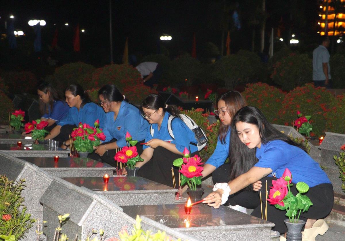 Đoàn viên cùng thắp hương, thắp nến tri ân tại Nghĩa trang liệt sĩ tỉnh Vĩnh Long (26/7/2025). Ảnh: Lê Thúy Hằng – TTXVN