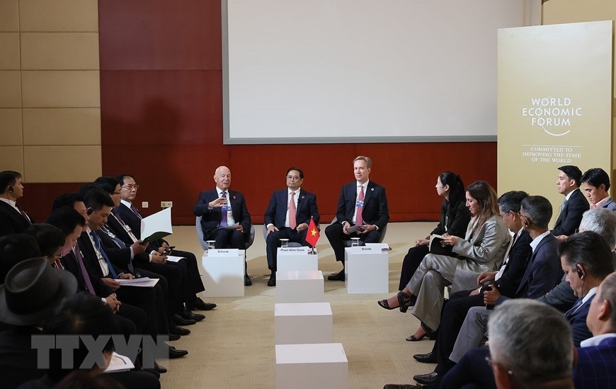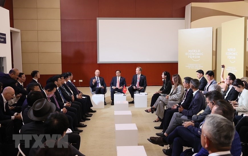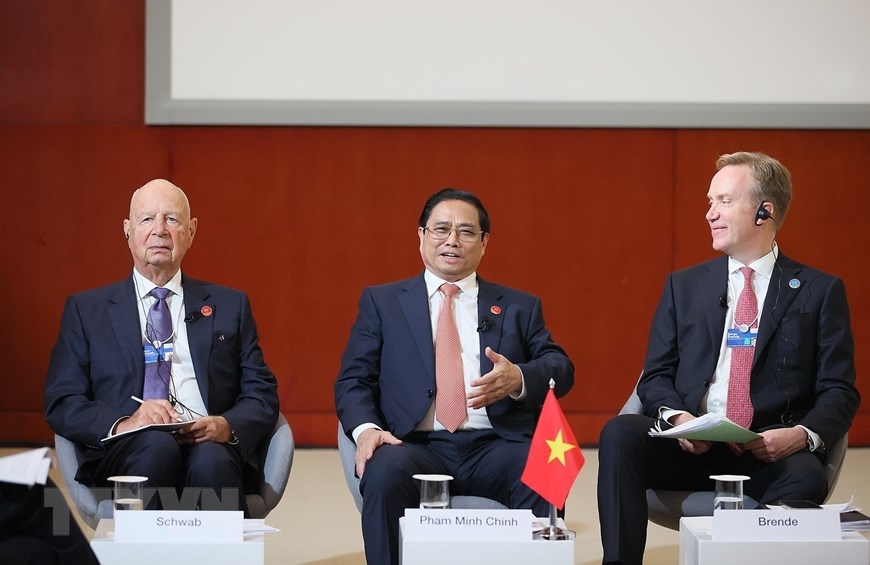 Thủ tướng Phạm Minh Chính trao trao đổi với Nhà sáng lập kiêm Chủ tịch điều hành Diễn đàn Kinh tế Thế giới (WEF) Klaus Schwab (bên trái) và Chủ tịch Diễn đàn Kinh tế thế giới (WEF) Børge Brende. (Ảnh: Dương Giang/TTXVN)