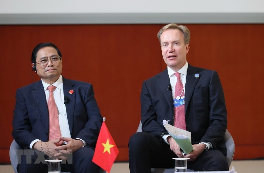 Trong khuôn khổ Hội nghị thường niên các nhà tiên phong lần thứ 14 của Diễn đàn Kinh tế Thế giới (WEF) tại Thiên Tân (Trung Quốc), chiều 26/6, Thủ tướng Phạm Minh Chính dự phiên Đối thoại Chiến lược Quốc gia Việt Nam-WEF. (Ảnh: Dương Giang/TTXVN)