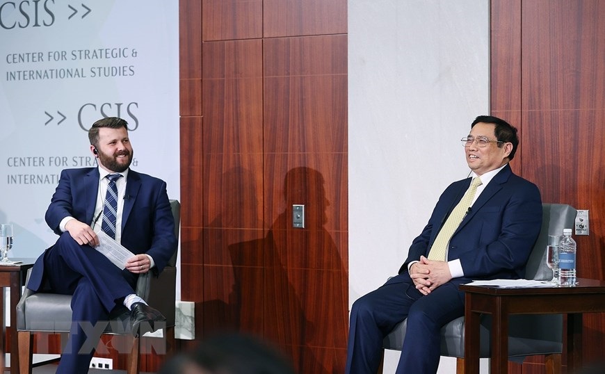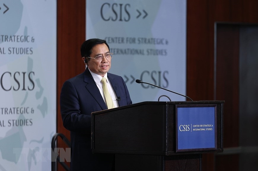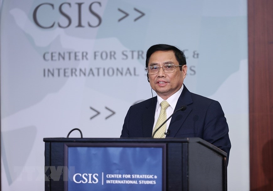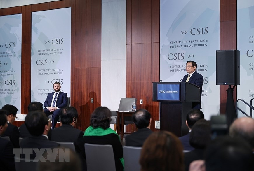 Thủ tướng Phạm Minh Chính dự và phát biểu tại Viện Nghiên cứu Chiến lược quốc tế Hoa Kỳ (CSIS). (Ảnh: Dương Giang/TTXVN)