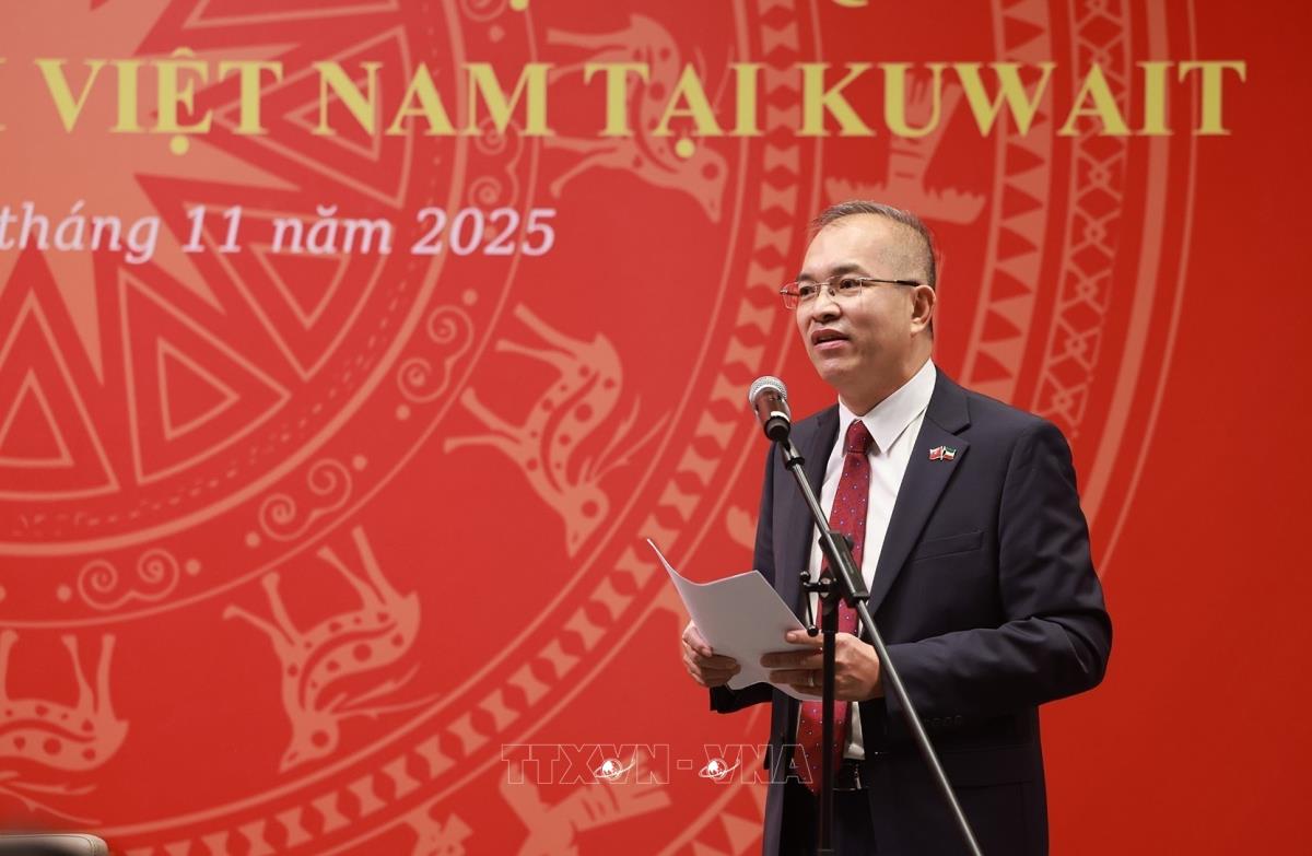 Đại sứ Việt Nam tại Kuwait Nguyễn Đức Thắng báo cáo tình hình cộng đồng người Việt Nam tại Kuwait (16/11/2025). Ảnh: Dương Giang-TTXVN