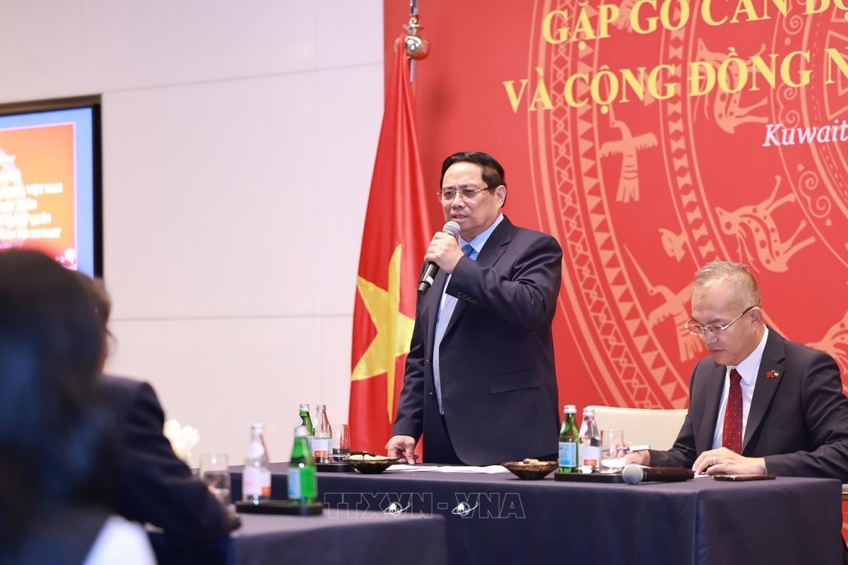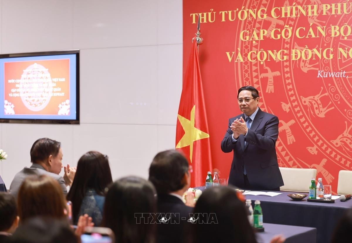 Thủ tướng Phạm Minh Chính gặp cán bộ Đại sứ quán và cộng đồng người Việt Nam tại Kuwait (16/11/2025). Ảnh: Dương Giang-TTXVN
