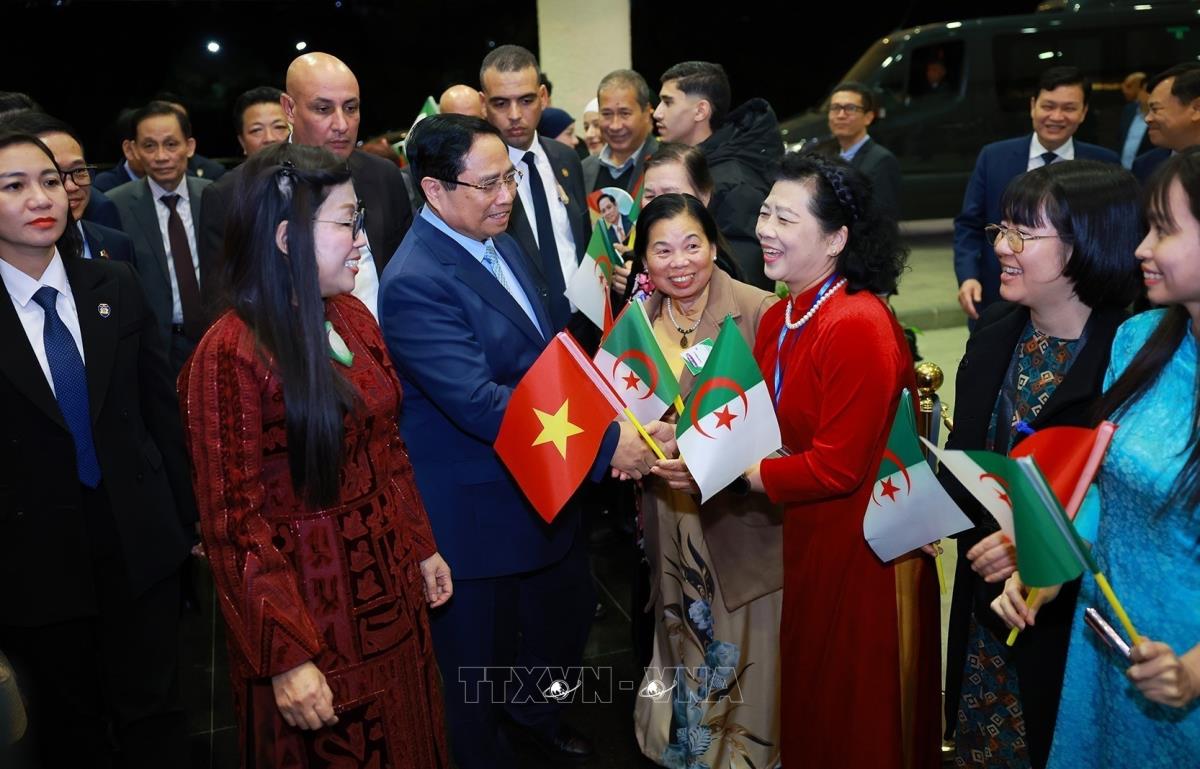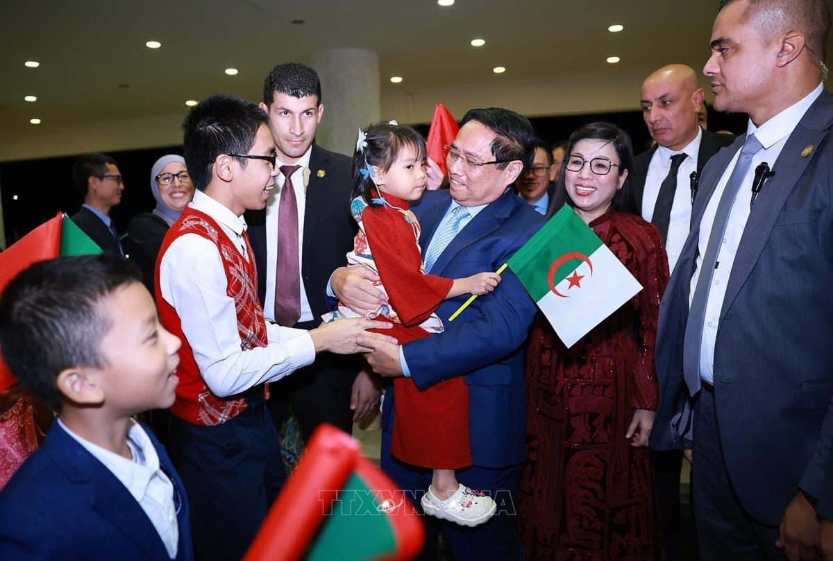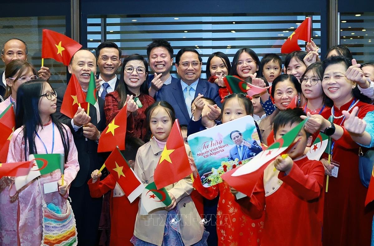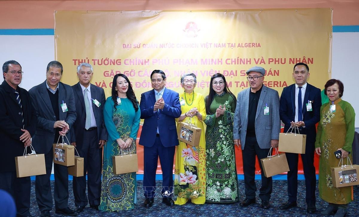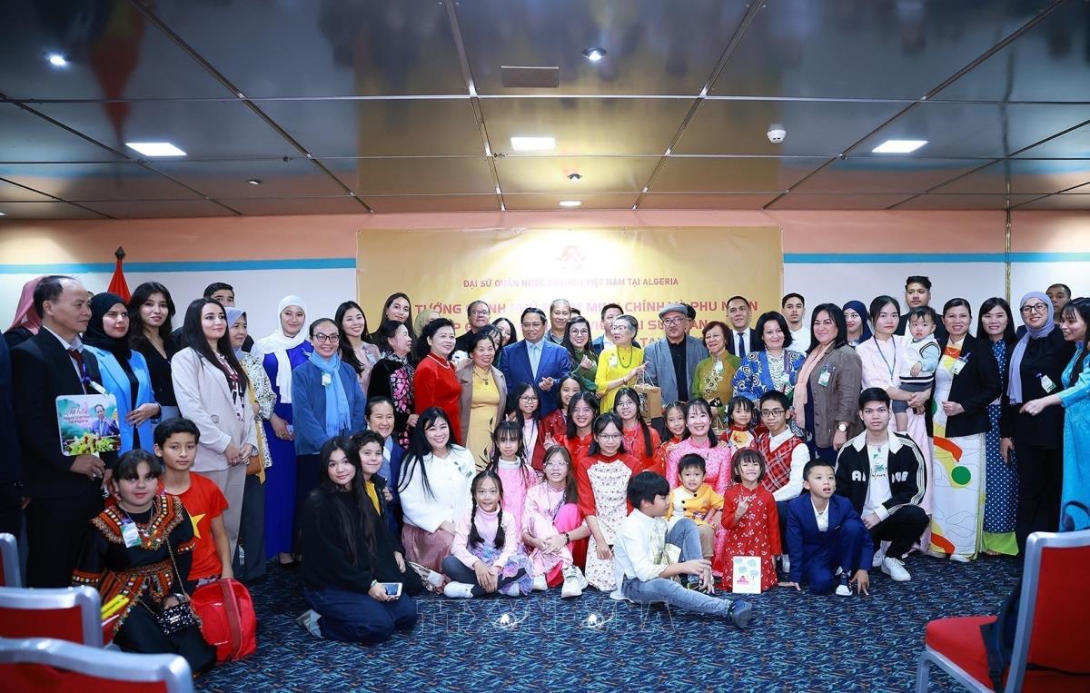 Thủ tướng Phạm Minh Chính và Phu nhân gặp đại diện cộng đồng người Việt Nam tại Algeria (18/11/2025). Ảnh: Dương Giang-TTXVN