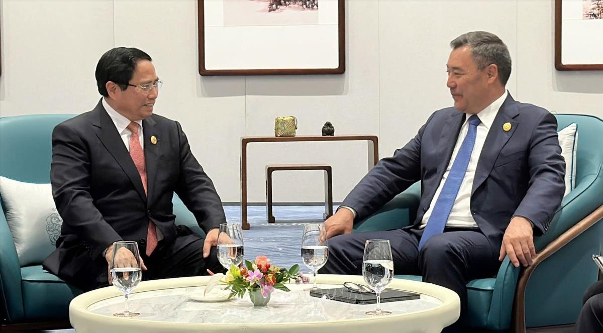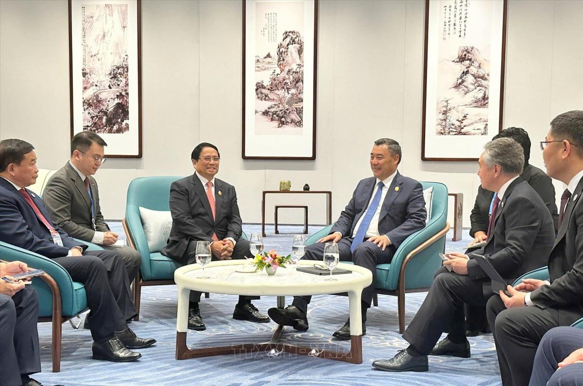 Thủ tướng Phạm Minh Chính gặp Tổng thống Kyrgyzstan Sadyr Japarov (1/9/2025). Ảnh: TTXVN phát