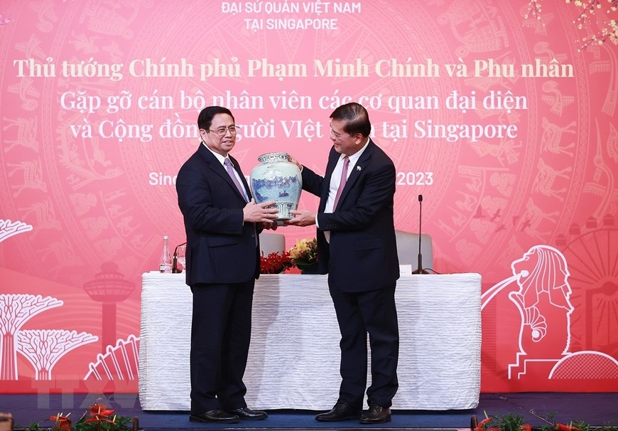 Hà Nội (TTXVN 8/2/2023) Trong chương trình thăm chính thức Cộng hòa Singapore, tối 8/2/2023, Thủ tướng Phạm Minh Chính và Phu nhân gặp gỡ cán bộ, nhân viên các cơ quan đại diện và cộng đồng người Việt Nam tại Singapore.