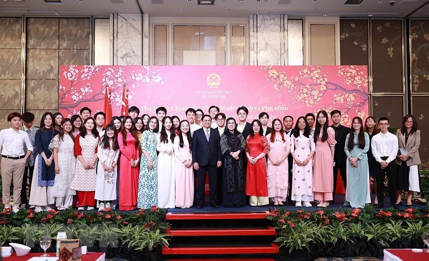 Thủ tướng Phạm Minh Chính và Phu nhân với cộng đồng người Việt Nam tại Singapore. (Ảnh: Dương Giang/TTXVN)