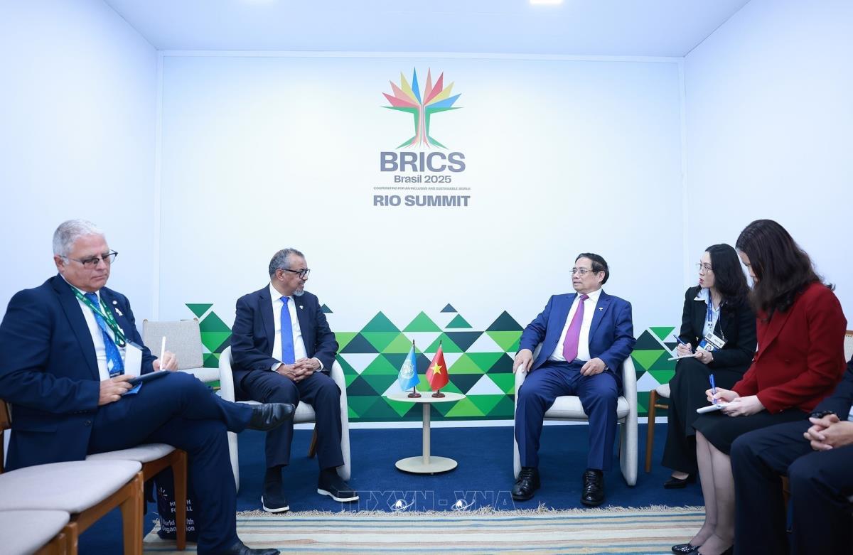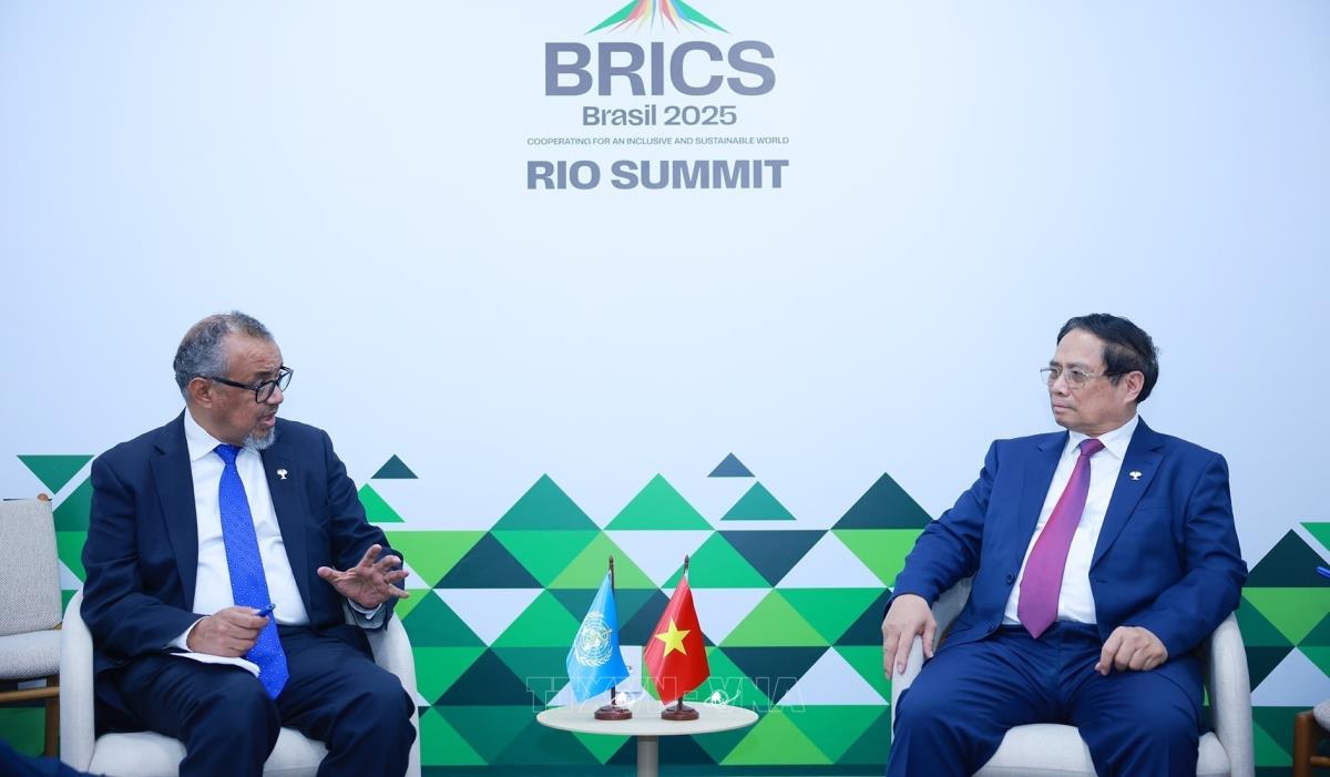Nhân dịp tham dự Hội nghị Thượng đỉnh Nhóm các nền kinh tế mới nổi (BRICS) mở rộng năm 2025 tại thành phố Rio de Janeiro (Brazil), tối 6/7/2025, giờ địa phương (sáng 7/7, giờ Hà Nội), Thủ tướng Phạm Minh Chính gặp Tổng Giám đốc Tổ chức Y tế Thế giới (WHO) Tedros Adhanom Ghebreyesus.