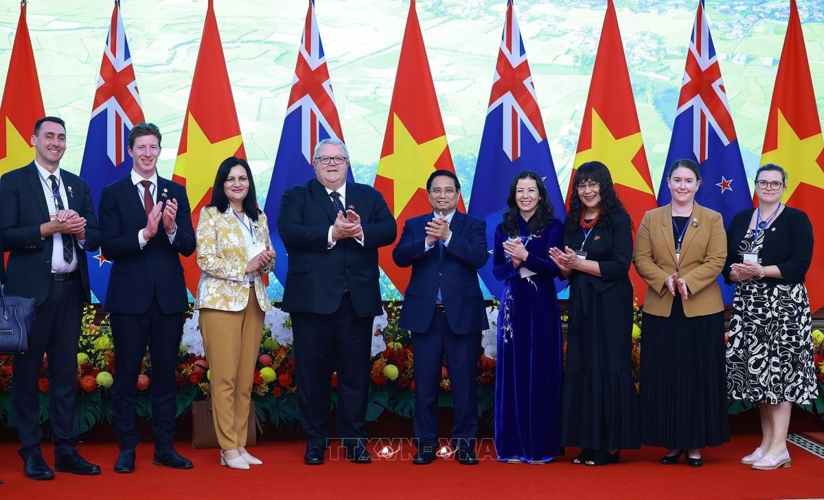 Thủ tướng Phạm Minh Chính và Chủ tịch Quốc hội New Zealand Gerry Brownlee cùng các thành viên đoàn. Ảnh: Dương Giang – TTXVN