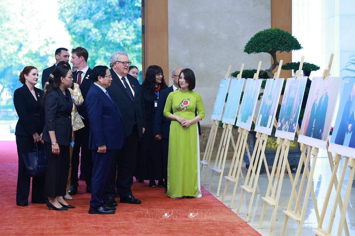 Thủ tướng Phạm Minh Chính và Chủ tịch Quốc hội New Zealand Gerry Brownlee tham quan trưng bày ảnh về quan hệ hợp tác giữa hai nước do TTXVN thực hiện (28/8/2025). Ảnh: Dương Giang– TTXVN