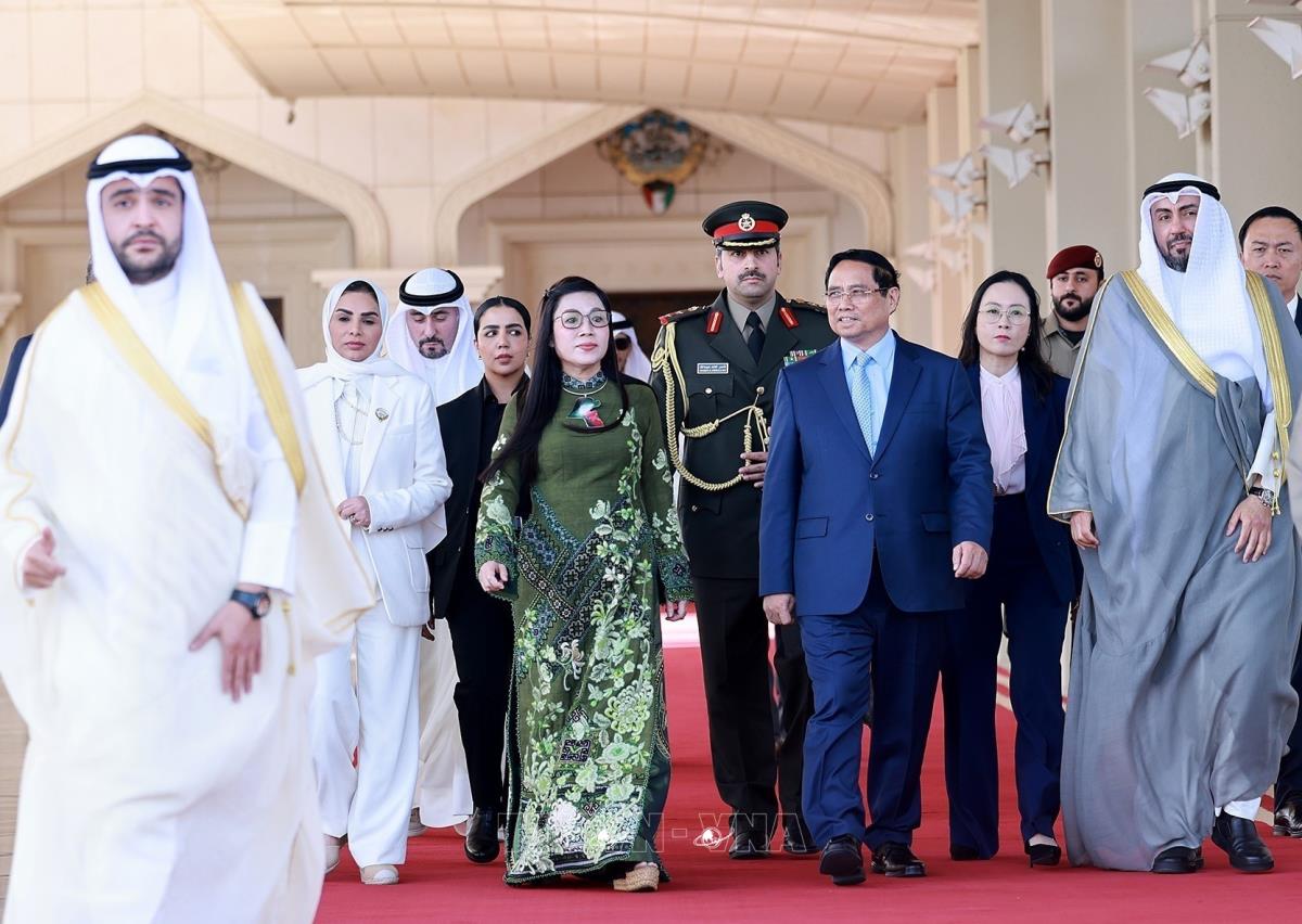 Lễ tiễn Thủ tướng Phạm Minh Chính và Phu nhân Lê Thị Bích Trân tại sân bay quốc tế Kuwait (18/11/2025). Ảnh: Dương Giang-TTXVN
