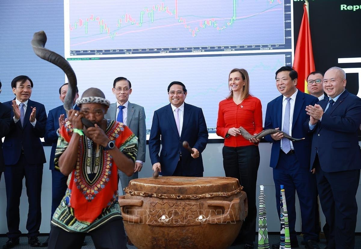 Thủ tướng Phạm Minh Chính tham dự khai trương phiên giao dịch tại Thị trường Chứng khoán Johannesburg (21/11/2025). Ảnh: Dương Giang-TTXVN