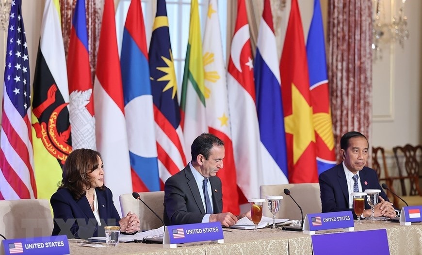 Thủ tướng Phạm Minh Chính cùng các lãnh đạo ASEAN ăn trưa và làm việc với Phó Tổng thống Hoa Kỳ Kamala Harris. (Ảnh: Dương Giang/TTXVN)