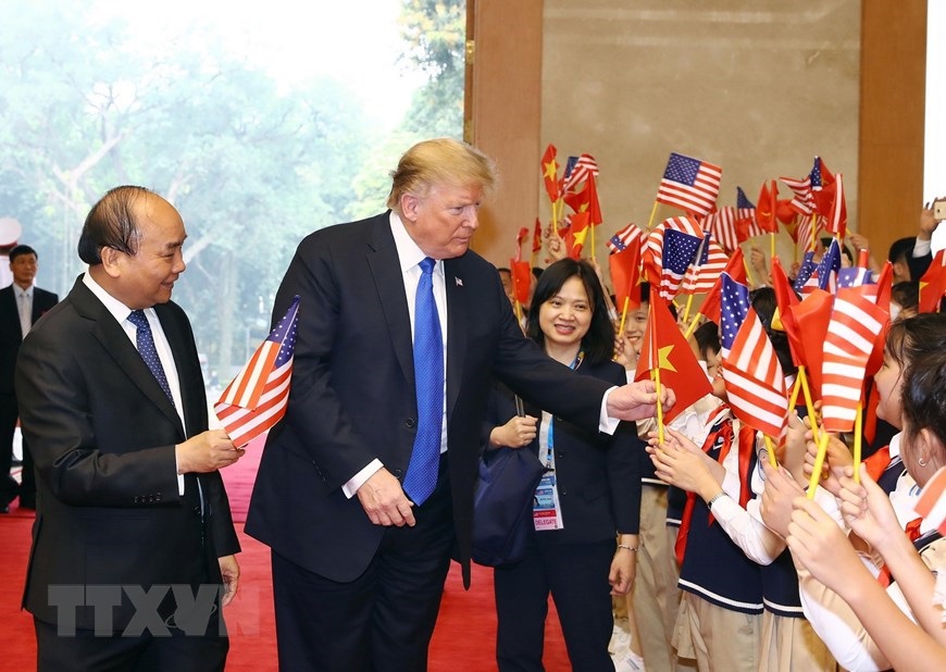 Thủ tướng Nguyễn Xuân Phúc đón Tổng thống Hoa Kỳ Donald Trump. (Ảnh: Thống Nhất/TTXVN)