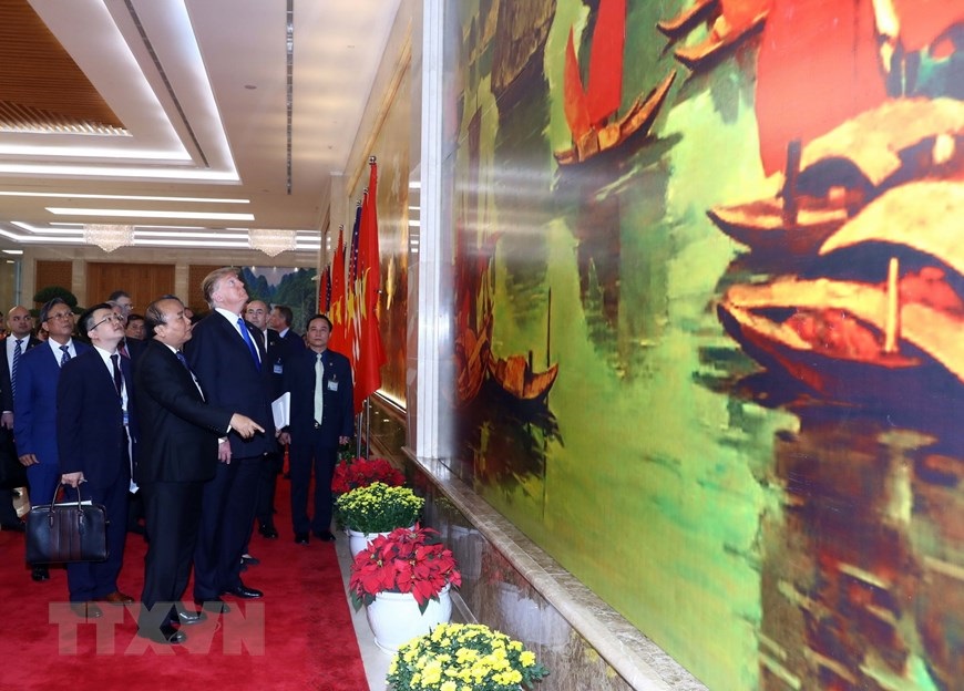 Thủ tướng Nguyễn Xuân Phúc giới thiệu với Tổng thống Hoa Kỳ Donald Trump một số hình ảnh về danh lam thắng cảnh của Việt Nam. (Ảnh: Thống Nhất/TTXVN)