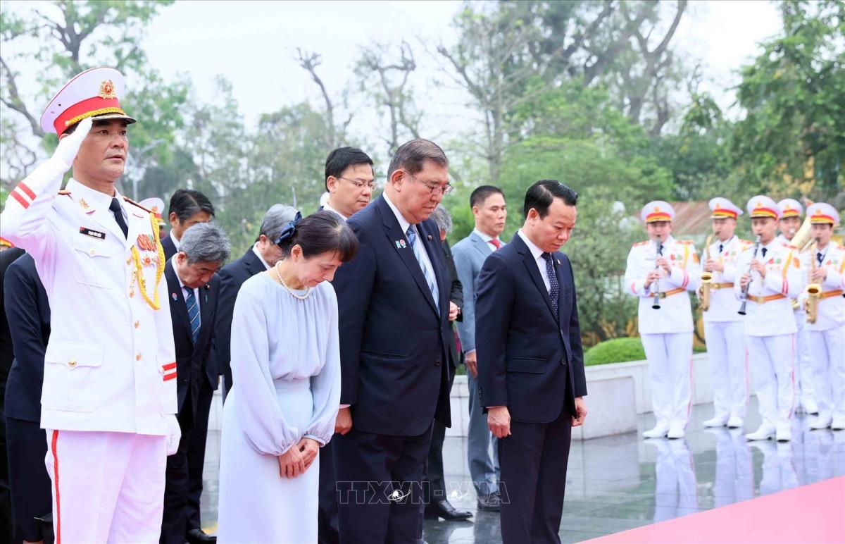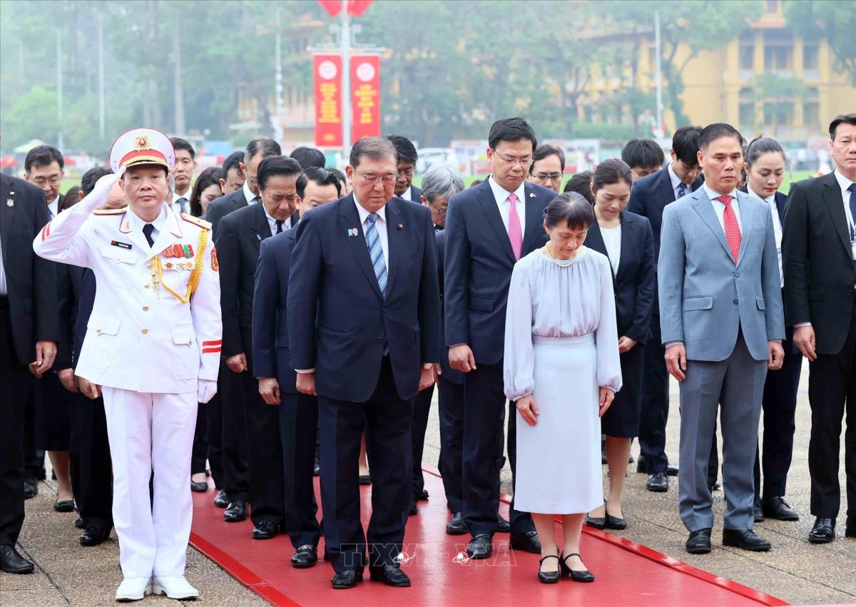Thủ tướng Nhật Bản Ishiba Shigeru và Phu nhân cùng các đại biểu thành kính tưởng nhớ Chủ tịch Hồ Chí Minh (28/4/2025). Ảnh: An Đăng - TTXVN