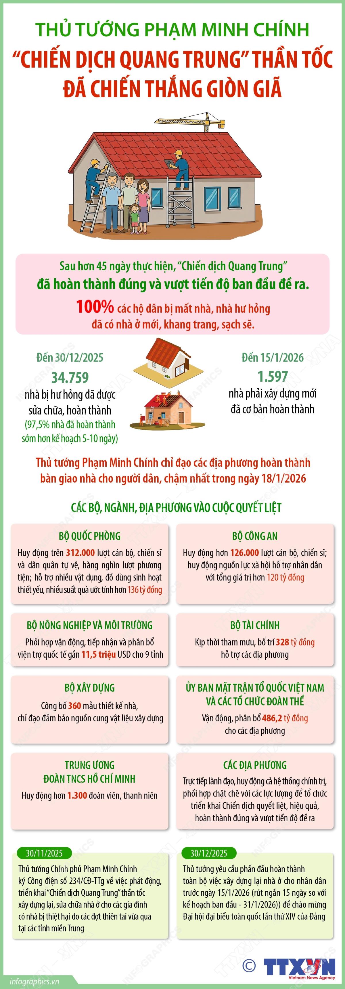 Hà Nội (TTXVN 16/1/2026) Sáng 16/1/2026, tại Trụ sở Chính phủ, Thủ tướng Chính phủ Phạm Minh Chính chủ trì Hội nghị trực tuyến với các tỉnh, thành phố miền Trung tổng kết “Chiến dịch Quang Trung” thần tốc xây dựng lại, sửa chữa nhà ở cho các hộ dân có nhà bị thiệt hại do thiên tai, bão, lũ tại miền Trung. Phát biểu tại Hội nghị, Thủ tướng Phạm Minh Chính nêu rõ, hòa trong không khí hân hoan và tràn đầy niềm tin hướng về Đại hội XIV của Đảng, đến ngày hôm nay, chúng ta có thể tự tin khẳng định "Chiến dịch Quang Trung" mặc dù không có tiếng súng nhưng đã "tốc chiến, tốc thắng", không những "chiến thắng" mà còn "chiến thắng giòn giã". Đây không chỉ là niềm vui, niềm hạnh phúc của các hộ dân bị mất nhà, hư hỏng nhà trong đợt thảm họa thiên tai tại miền Trung ruột thịt vừa qua, mà đã hòa vào thành niềm vui chung của đất nước, của dân tộc ngay trước thềm Đại hội XIV của Đảng và dịp Tết Nguyên đán Bính Ngọ.