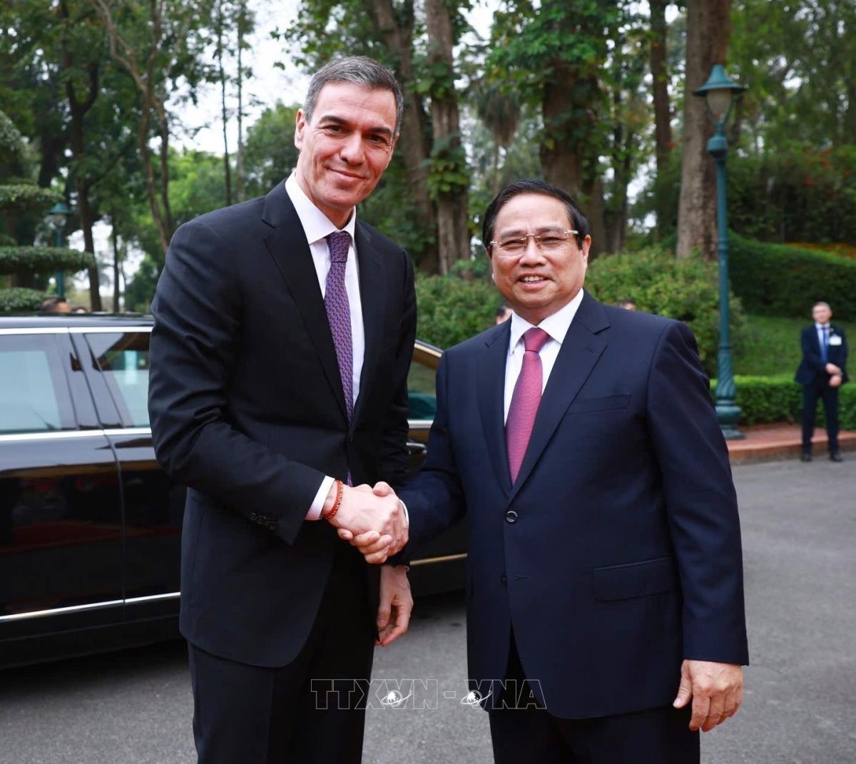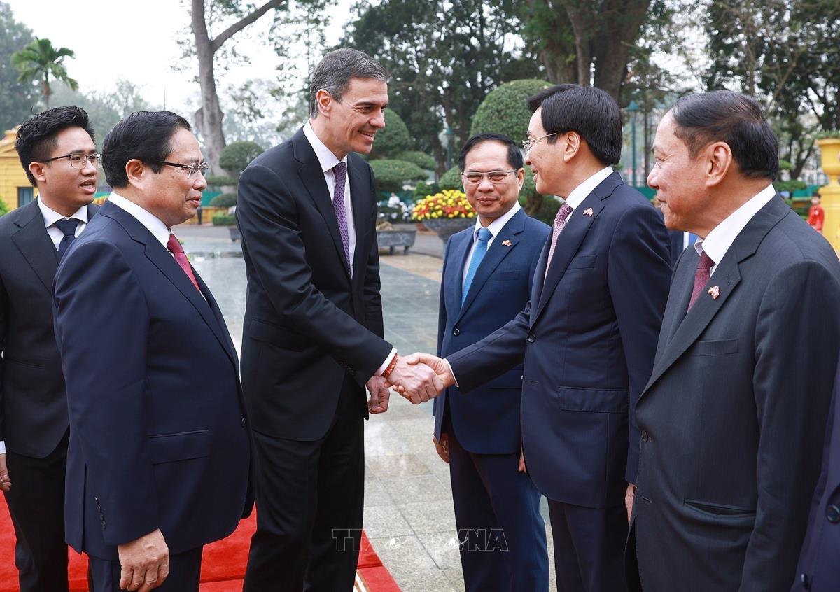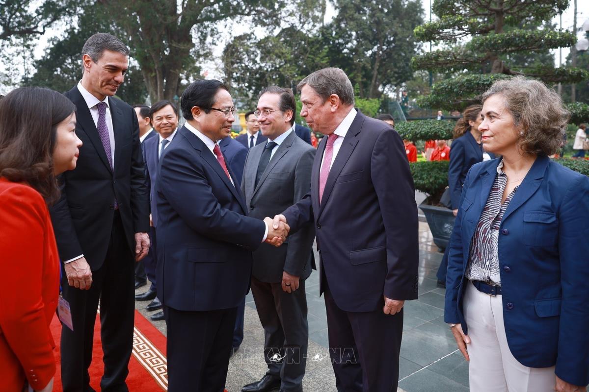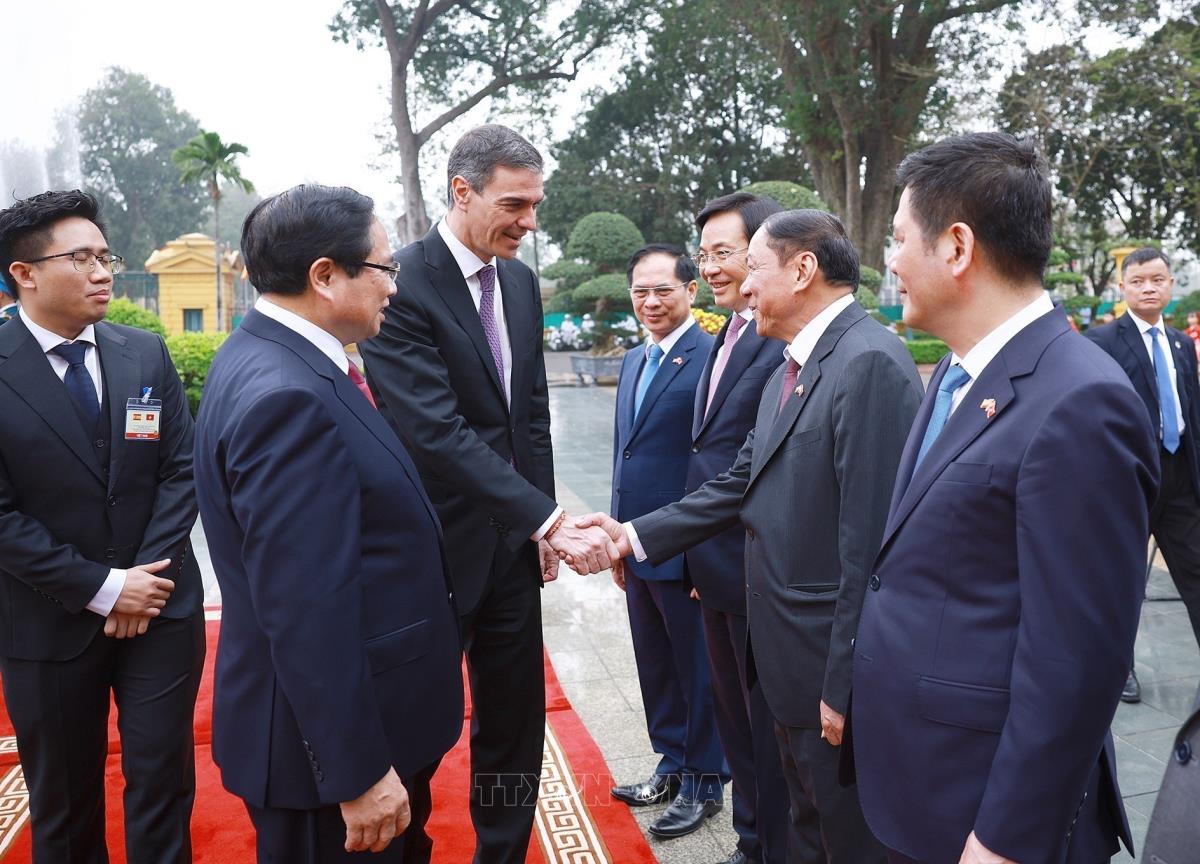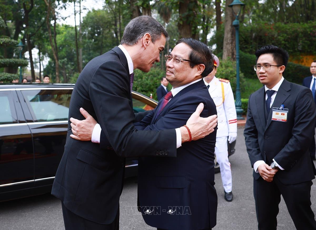 Thủ tướng Phạm Minh Chính đón Thủ tướng Vương quốc Tây Ban Nha Pedro Sánchez thăm chính thức Việt Nam (9/4/2025). Ảnh: Dương Giang-TTXVN