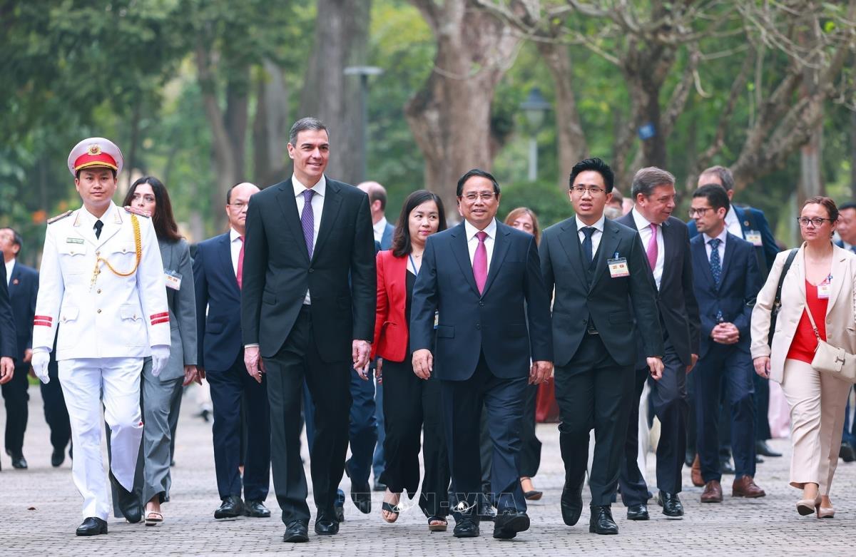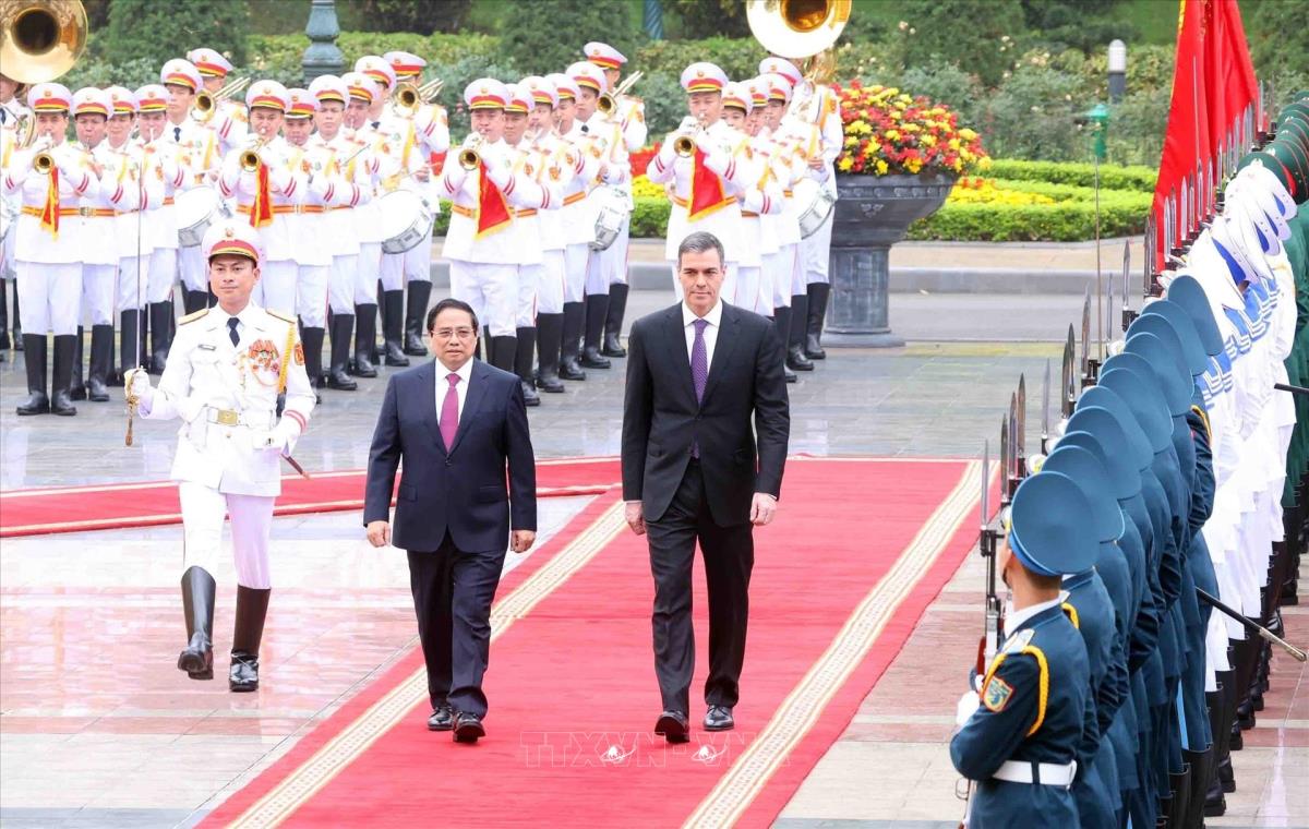 Thủ tướng Phạm Minh Chính và Thủ tướng Tây Ban Nha Pedro Sánchez tại lễ đón (9/4/2025). Ảnh: Dương Giang – TTXVN