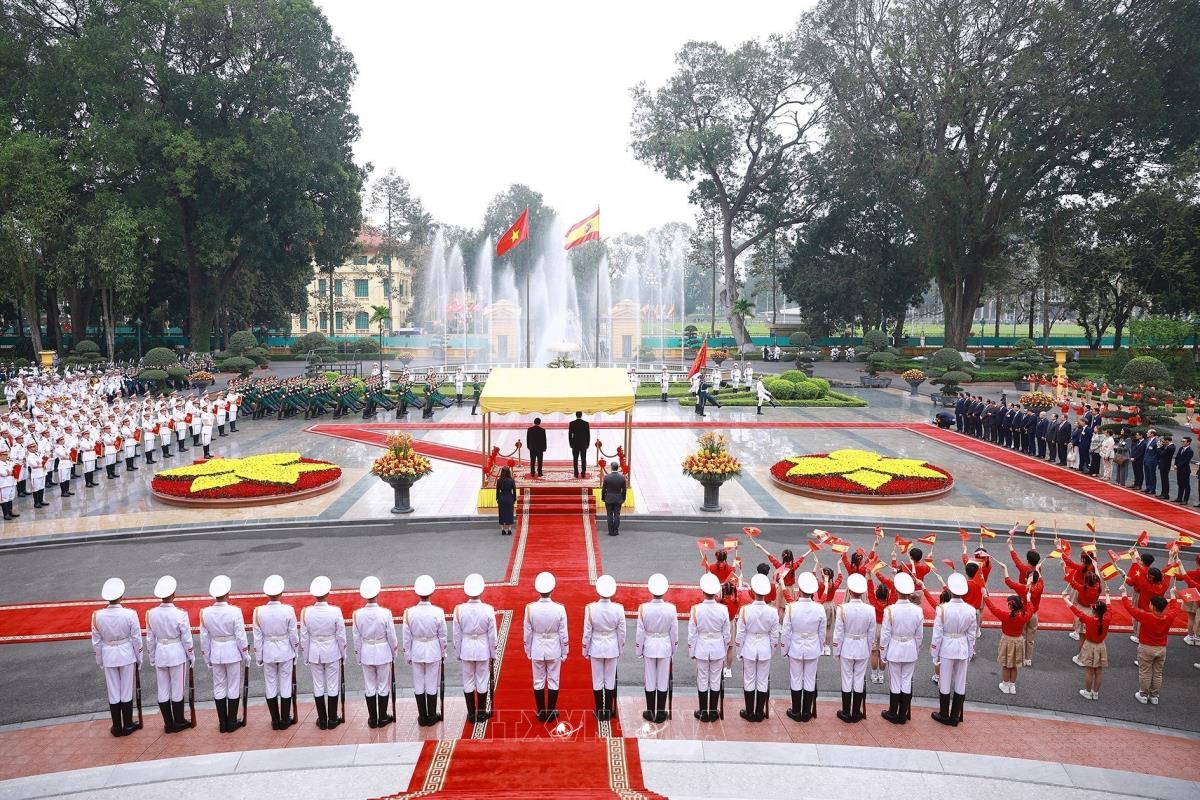 Lễ đón Thủ tướng Tây Ban Nha Pedro Sánchez thăm chính thức Việt Nam (9/4/2025). Ảnh: Dương Giang – TTXVN