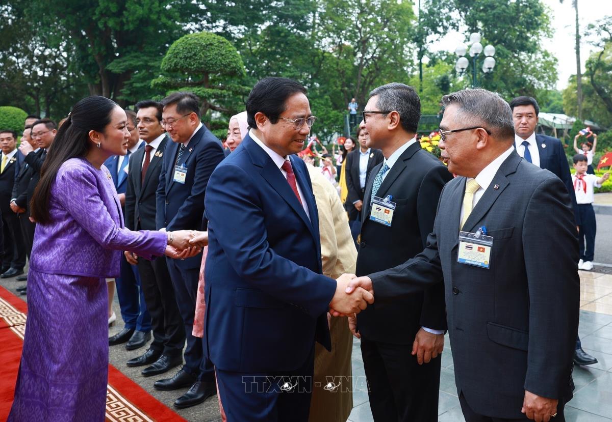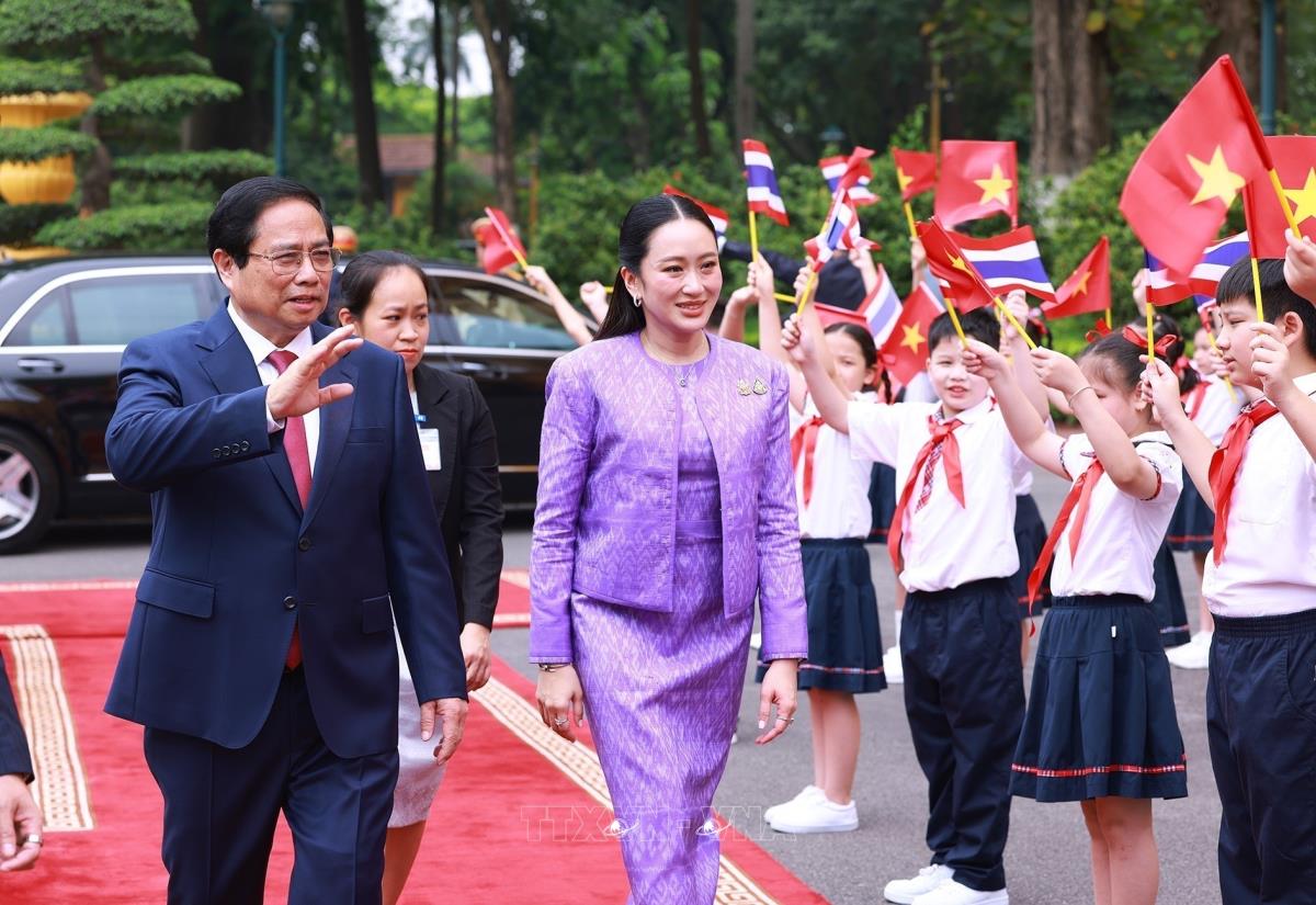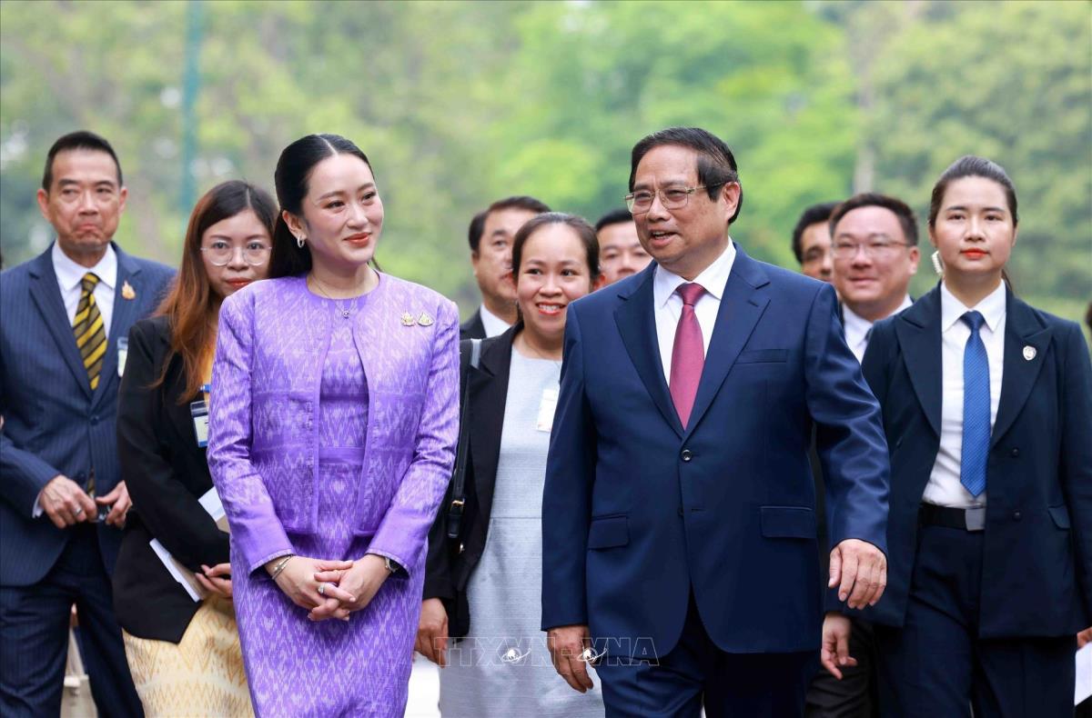 Thủ tướng Phạm Minh Chính đón Thủ tướng Thái Lan Paetongtarn Shinawatra (16/5/2025). Ảnh: Dương Giang - TTXVN