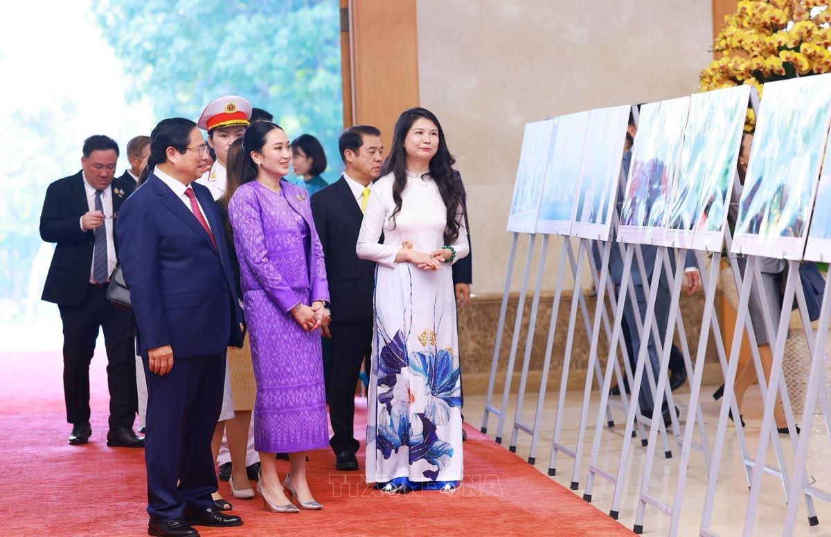 Thủ tướng Phạm Minh Chính và Thủ tướng Thái Lan Paetongtarn Shinawatra tham quan trưng bày ảnh về quan hệ hợp tác giữa hai nước do Thông tấn xã Việt Nam thực hiện (16/5/2025). Ảnh: Dương Giang-TTXVN