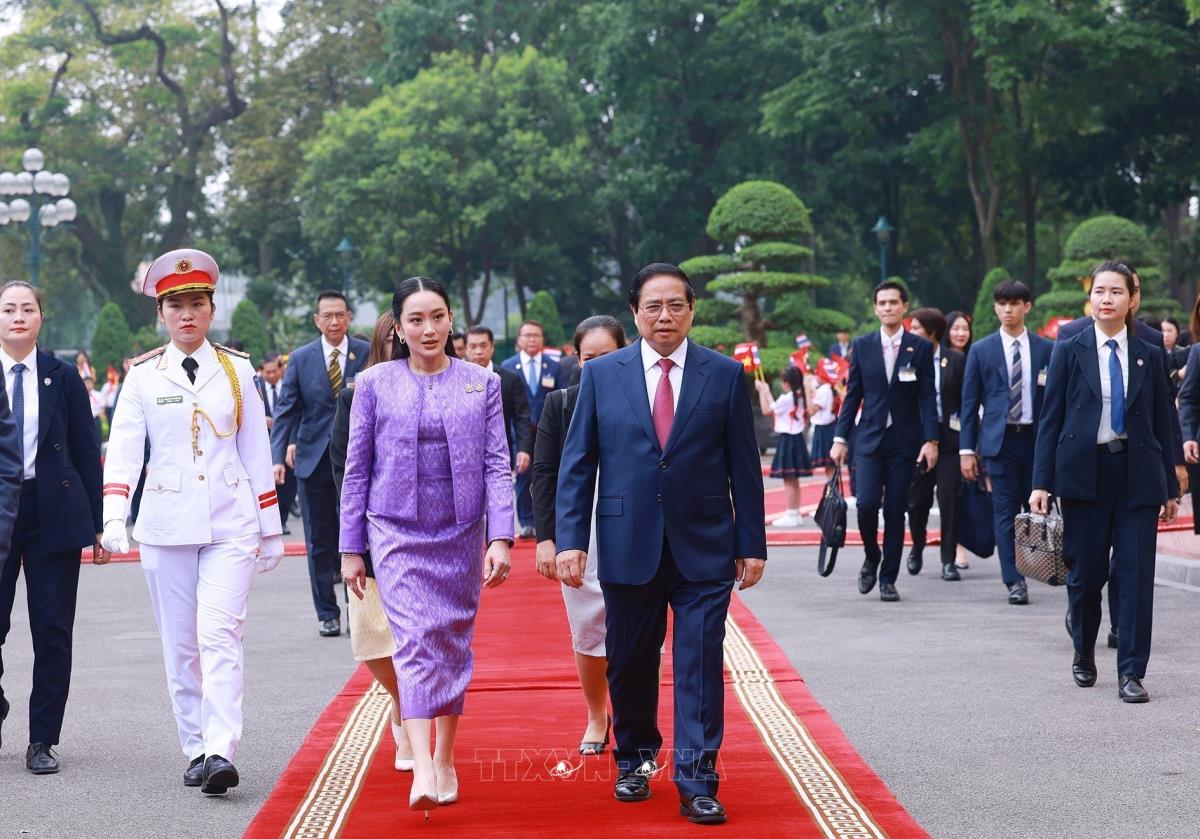 Thủ tướng Phạm Minh Chính và Thủ tướng Thái Lan Paetongtarn Shinawatra tại lễ đón (16/5/2025). Ảnh: Dương Giang-TTXVN