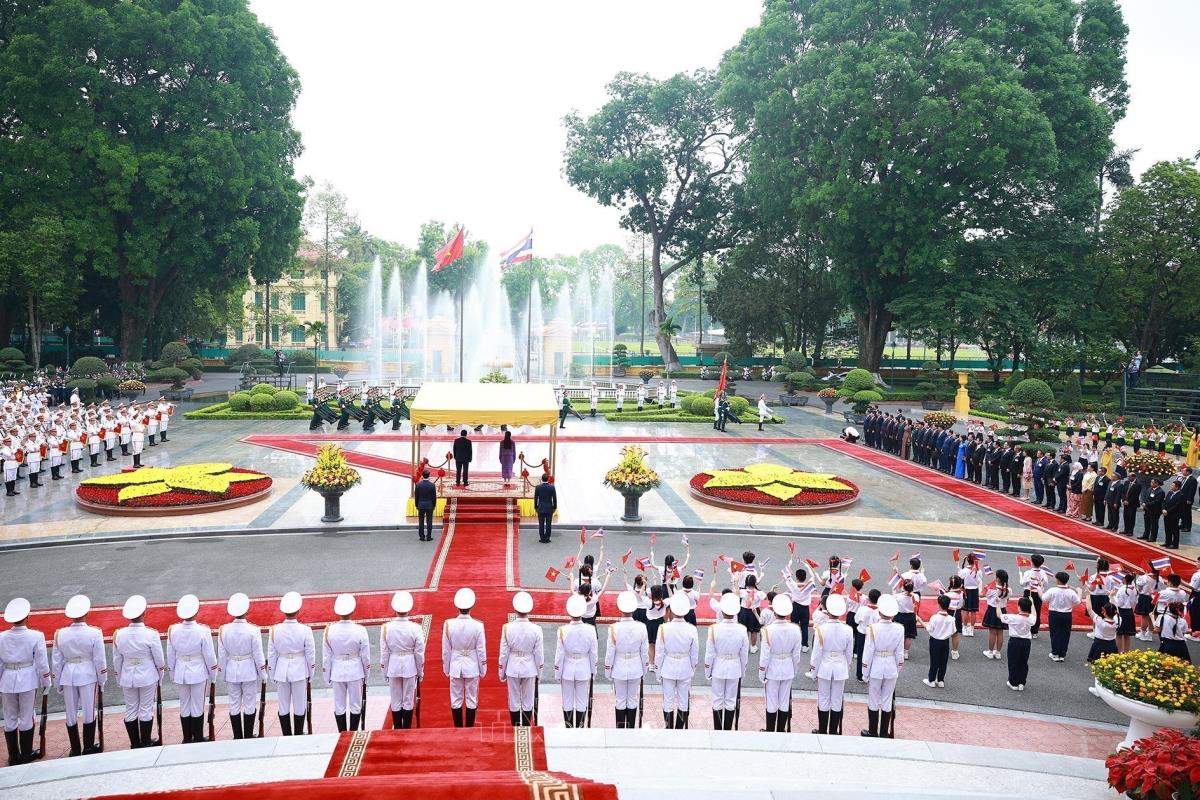 Lễ đón Thủ tướng Vương quốc Thái Lan Lan Paetongtarn Shinawatra thăm chính thức Việt Nam (16/5/2025). Ảnh: Dương Giang-TTXVN