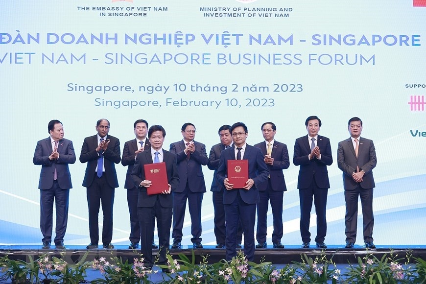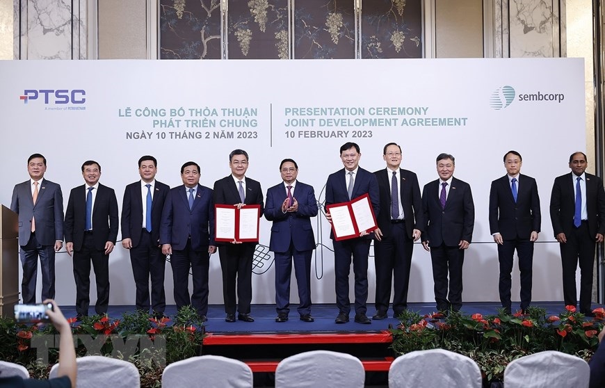 Thủ tướng Phạm Minh Chính và ông Tow Heng Tan, Phó Chủ tịch Hội đồng Quản trị Tập đoàn Sembcorp chứng kiến trao Thoả thuận hợp tác phát triển chung giữa Tổng Công ty Cổ phần dịch vụ kỹ thuật Dầu khí Việt Nam và Công ty Sembcorp Utilities. (Ảnh: Dương Giang/TTXVN)