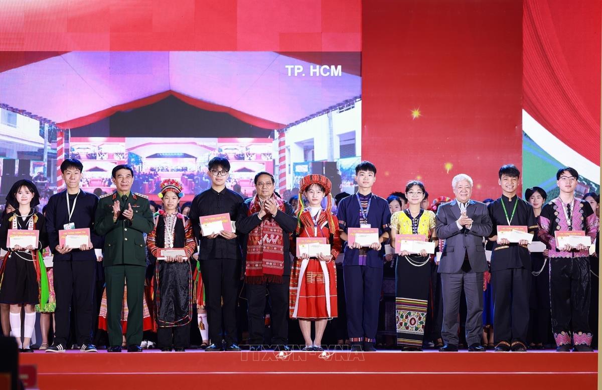 * Nhân dịp này, Thủ tướng Chính phủ Phạm Minh Chính đã trao 60 suất quà ý nghĩa, tặng học sinh người dân tộc thiểu số và học sinh xuất sắc, tiêu biểu của Trường phổ thông vùng cao Việt Bắc; tặng Trường Phổ thông vùng cao Việt Bắc 3 phòng học: ngoại ngữ, nghệ thuật và công nghệ thông tin. Bộ trưởng Bộ Quốc phòng, Đại tướng Phan Văn Giang cũng trao 50 suất quà tặng học sinh xuất sắc, tiêu biểu của Trường phổ thông vùng cao Việt Bắc./.