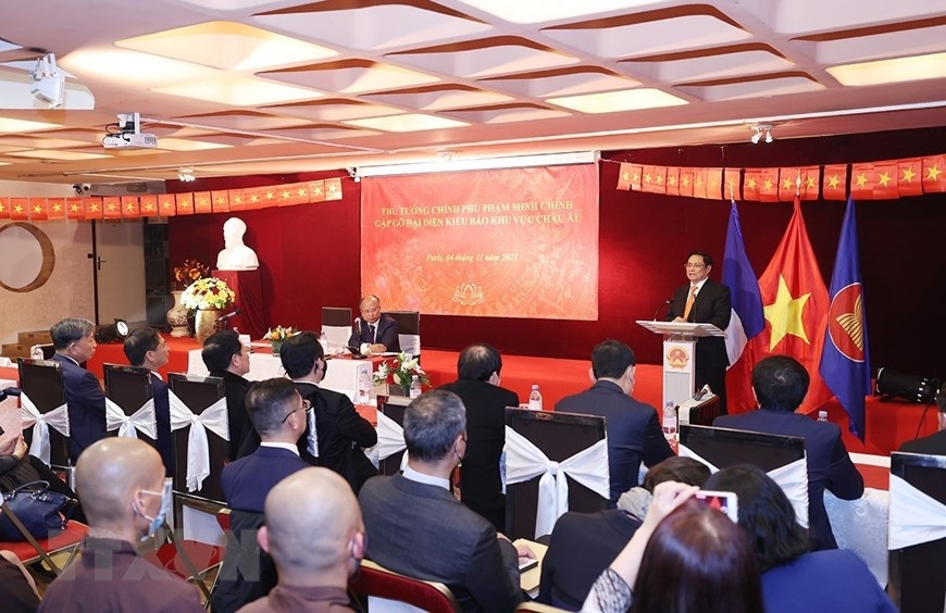 Hà Nội (TTXVN 5/11/2021) Tối 4/11/2021 (giờ địa phương), tại Thủ đô Paris (Cộng hòa Pháp), Thủ tướng Chính phủ Phạm Minh Chính gặp gỡ đại diện kiều bào khu vực châu Âu.