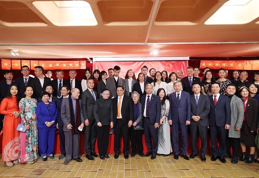 Thủ tướng Phạm Minh Chính gặp gỡ kiều bào khu vực châu Âu. (Ảnh: Dương Giang/TTXVN)