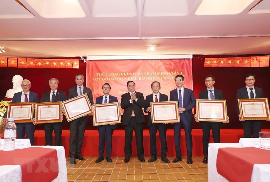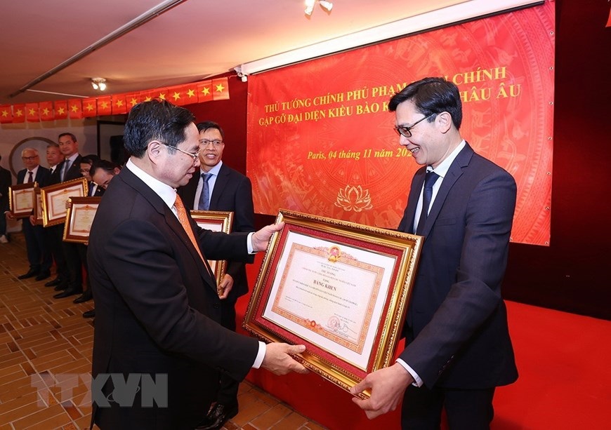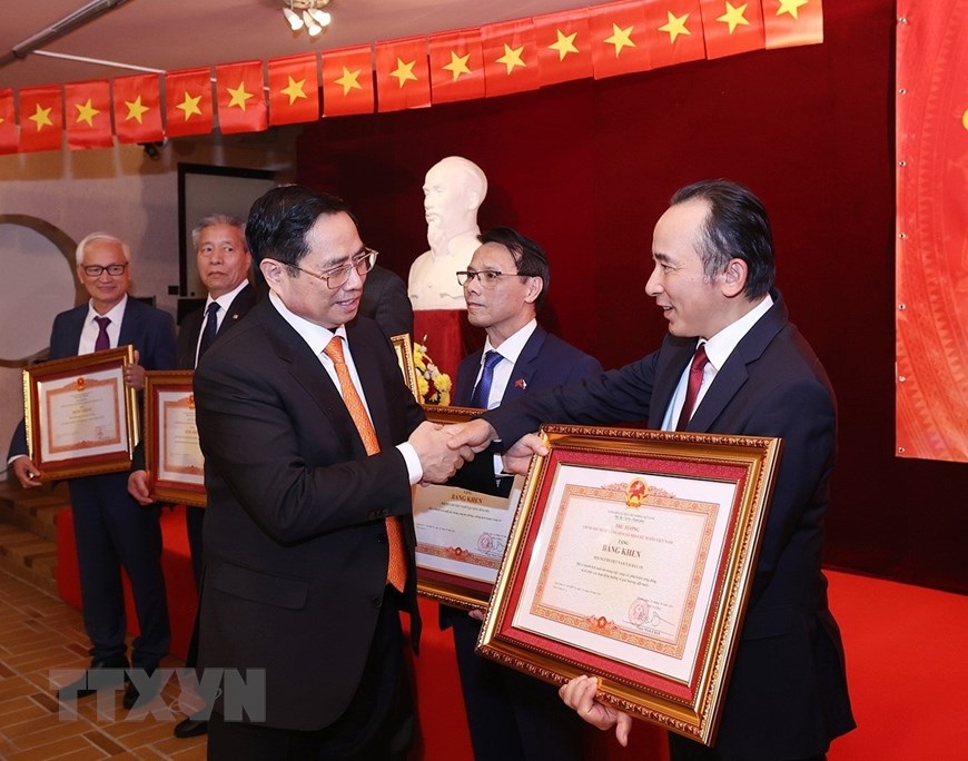 Thủ tướng Phạm Minh Chính tặng Bằng khen cho các kiều bào có thành tích trong công tác phòng, chống dịch. (Ảnh: Dương Giang/TTXVN)