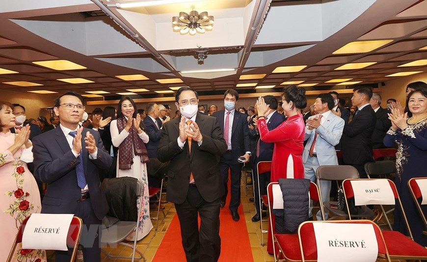 Thủ tướng Phạm Minh Chính với các kiều bào. (Ảnh: Dương Giang/TTXVN)
