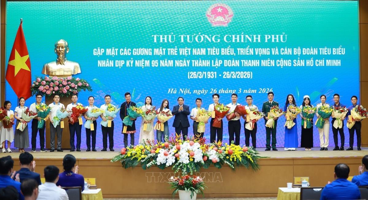 Hà Nội (TTXVN 26/3/2026) Nhân kỷ niệm 95 năm Ngày thành lập Đoàn Thanh niên cộng sản Hồ Chí Minh (26/3/1931-26/3/2026), chiều 26/3/2026, tại Hà Nội, Thủ tướng Phạm Minh Chính gặp mặt Gương mặt trẻ Việt Nam tiêu biểu, triển vọng và cán bộ Đoàn tiêu biểu.
