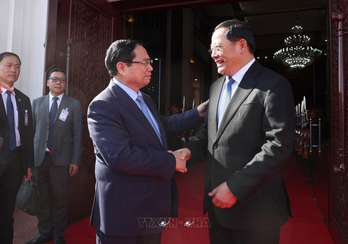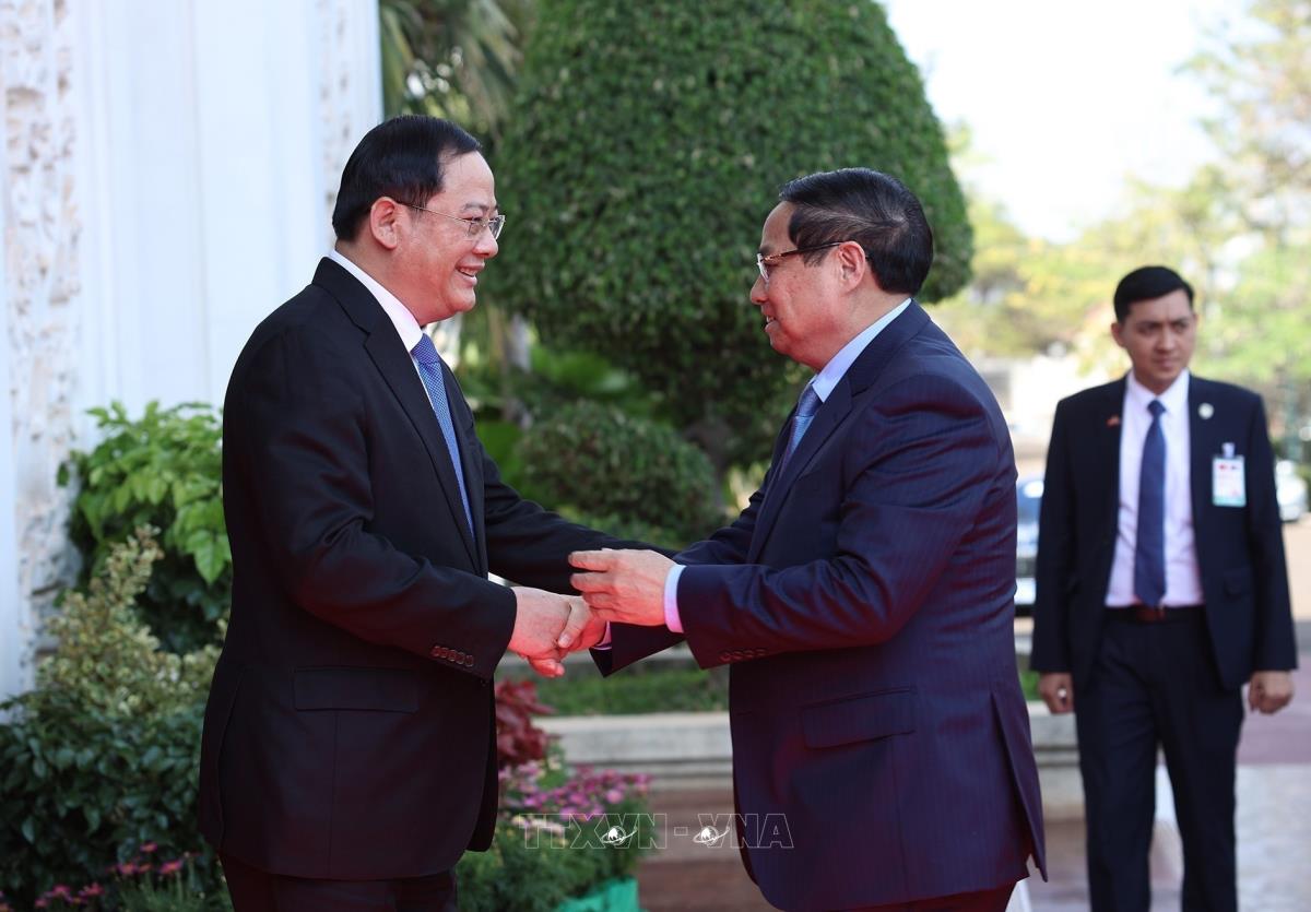 Thủ tướng Phạm Minh Chính gặp Thủ tướng Lào Sonexay Siphandone (5/2/2026). Ảnh: Dương Giang-TTXVN