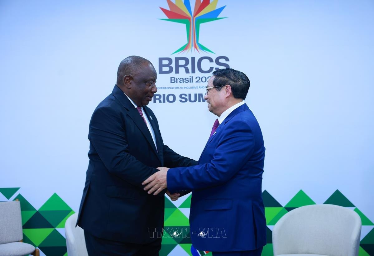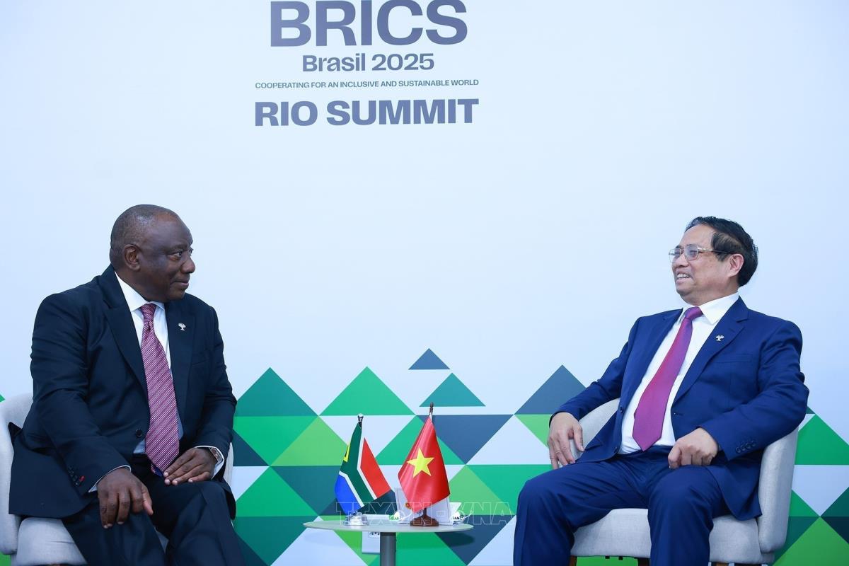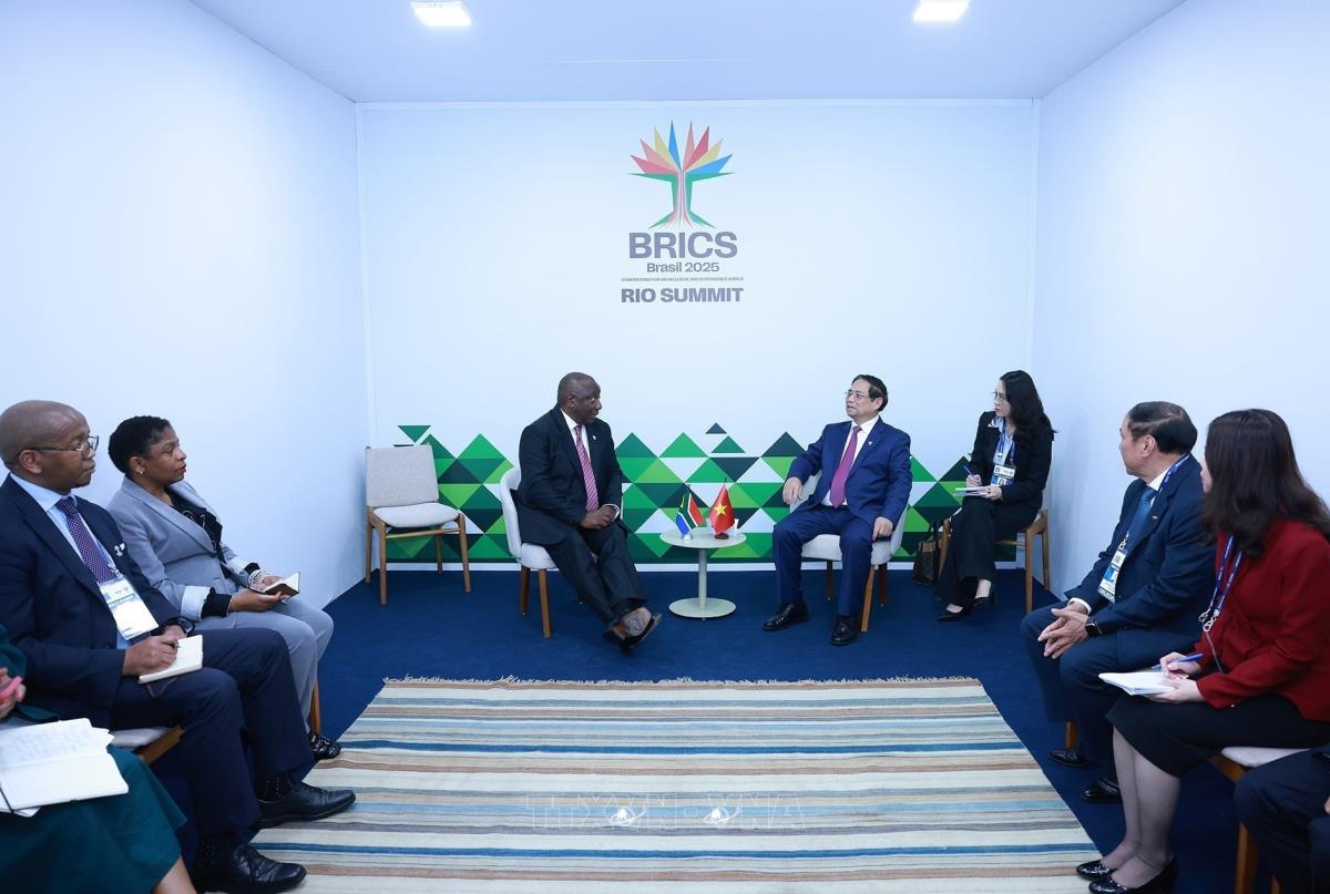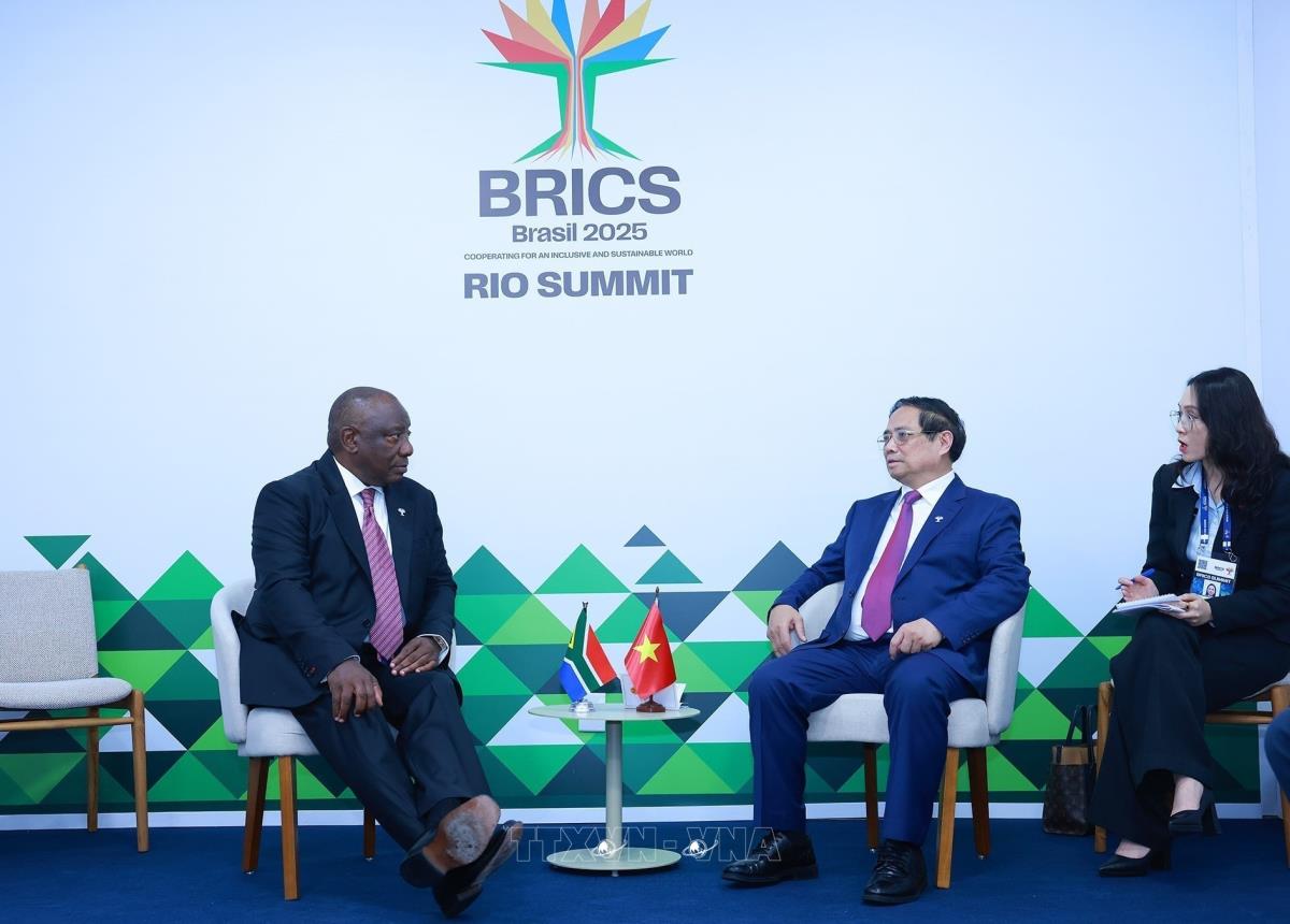 Nhân dịp tham dự Hội nghị Thượng đỉnh Nhóm các nền kinh tế mới nổi (BRICS) mở rộng năm 2025 tại thành phố Rio de Janeiro (Brazil), tối 6/7/2025, giờ địa phương (sáng 7/7, giờ Hà Nội), Thủ tướng Phạm Minh Chính gặp Tổng thống Nam Phi Cyril Ramaphosa.