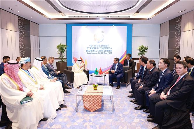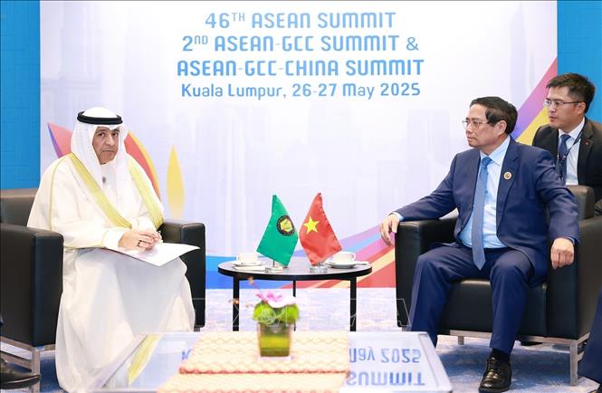 Hà Nội (TTXVN 27/5/2025) Theo đặc phái viên TTXVN, trong khuôn khổ thăm chính thức Malaysia và tham dự Hội nghị Cấp cao ASEAN lần thứ 46 và các hội nghị cấp cao liên quan, ngày 27/5, Thủ tướng Chính phủ Phạm Minh Chính đã gặp Tổng Thư ký Hội đồng Hợp tác Vùng Vịnh (GCC) Jasem Mohamed AlBudaiwi.