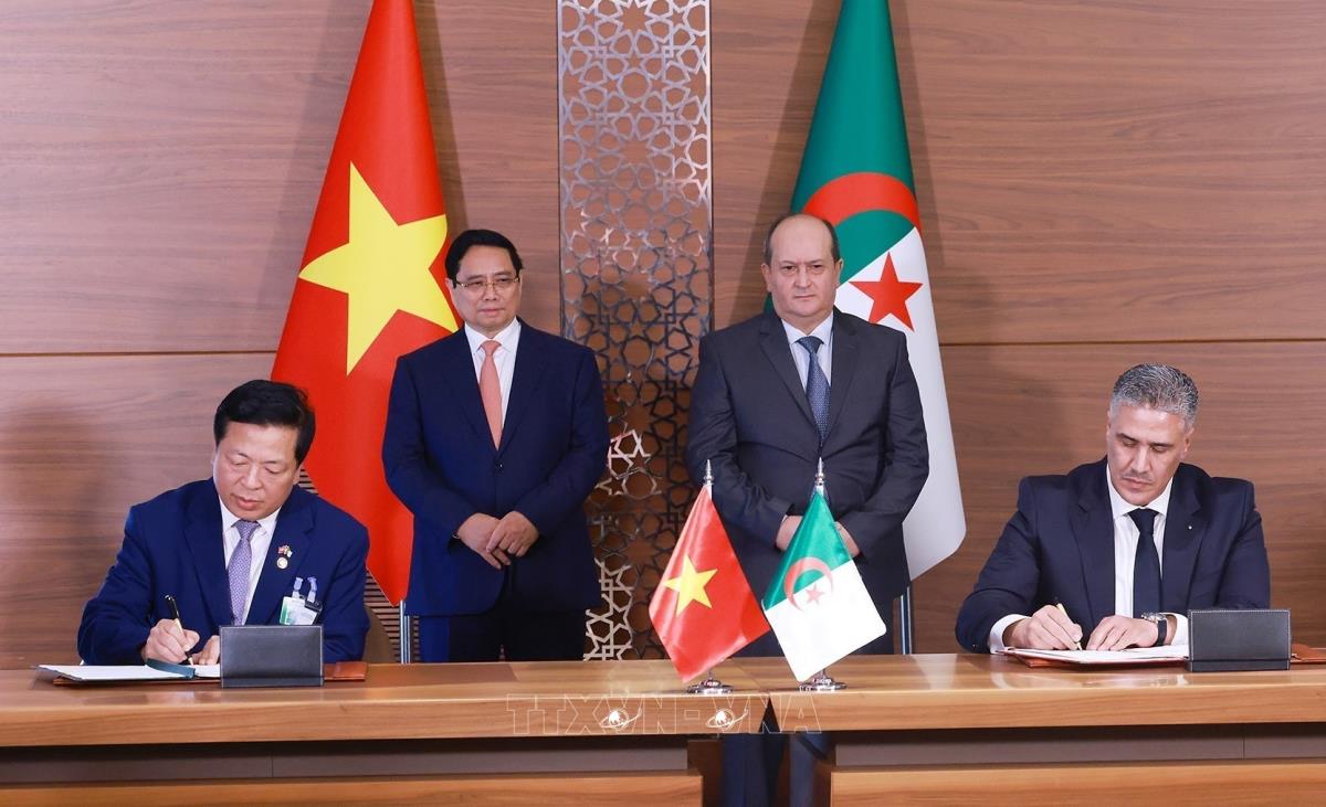 Trên tinh thần đó, Thủ tướng đề nghị hai bên phối hợp ưu tiên triển khai các nhóm giải pháp: Hai bên cần thắt chặt hơn nữa sự tin cậy chính trị, tăng cường trao đổi đoàn và dành ưu tiên cho nhau trong chính sách đối ngoại của mỗi nước; Algeria tiếp tục quan tâm, hỗ trợ Tập đoàn Công nghiệp Năng lượng Quốc gia Việt Nam (PVN) mở rộng đầu tư và hoạt động ổn định, hiệu quả, đóng góp tích cực hơn nữa vào sự phát triển của Algeria, là biểu tượng thành công cho hợp tác hai nước; Thúc đẩy hợp tác đầu tư, mở cửa thị trường hai nước cho mặt hàng thế mạnh của nhau, tăng cường trao đổi thương mại, bảo đảm cân bằng lợi ích của hai nước, trong đó Algeria hỗ trợ các doanh nghiệp Việt Nam tham gia các dự án chuyển đổi số, doanh nghiệp hai nước hợp tác trong lĩnh vực viễn thông.