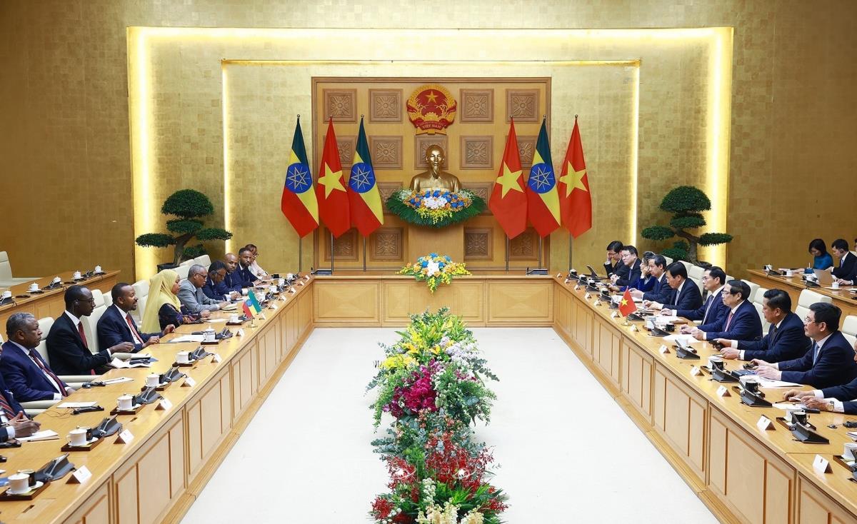 Thủ tướng Phạm Minh Chính nhấn mạnh, trước những biến động của tình hình kinh tế - căng thẳng thương mại toàn cầu, Việt Nam và Ethiopia cần thúc đẩy đối thoại và hiểu biết lẫn nhau nhằm tiếp tục đa dạng hóa thị trường, tạo thuận lợi cho hợp tác kinh tế, thương mại, đầu tư giữa hai nước.