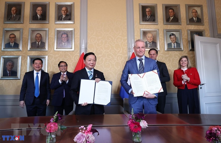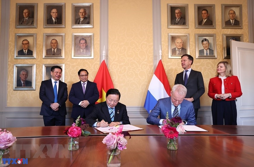 Thủ tướng Phạm Minh Chính và Thủ tướng Hà Lan Mark Rutte chứng kiến lễ ký Kế hoạch hành động chung về quản lý tài nguyên nước giữa Bộ Tài Nguyên Môi trường Việt Nam và Bộ Hạ tầng và Tài nguyên nước Hà Lan. (Ảnh: Dương Giang/TTXVN)