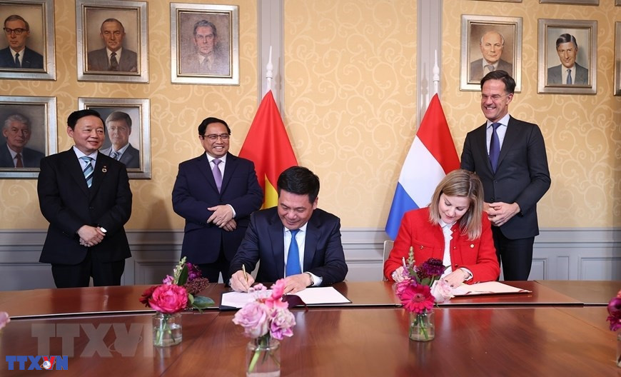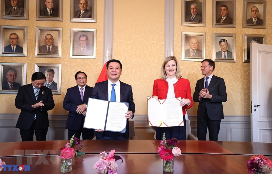 Thủ tướng Phạm Minh Chính và Thủ tướng Hà Lan Mark Rutte chứng kiến lễ ký Tuyên bố chung giữa Bộ Công Thương Việt Nam và Bộ Ngoại giao Vương quốc Hà Lan về hợp tác giảm phát thải trong sản xuất và tiêu dùng. (Ảnh: Dương Giang/TTXVN)