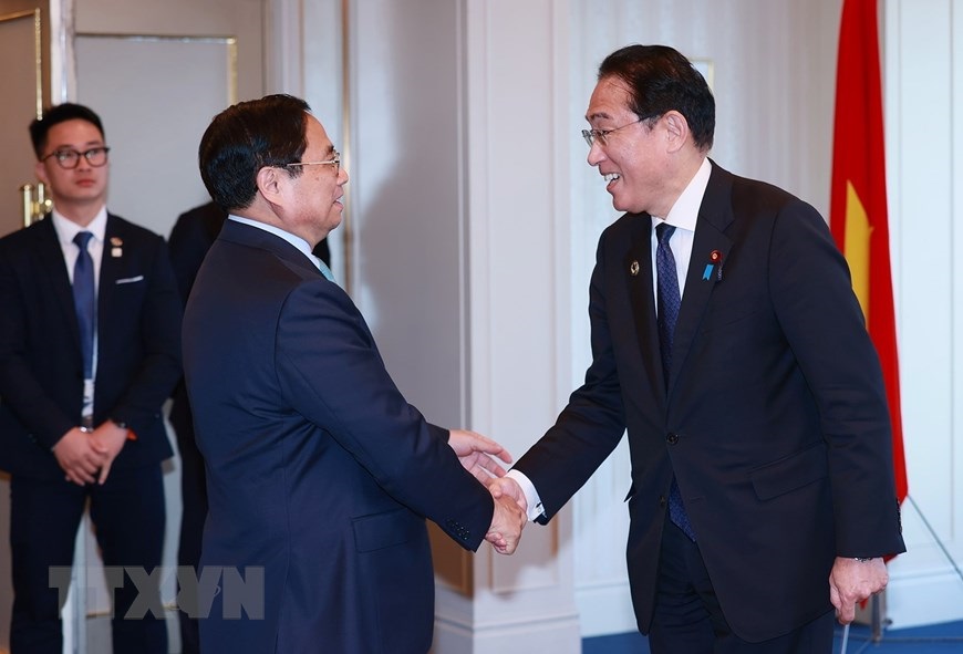 Thủ tướng Phạm Minh Chính và Thủ tướng Nhật Bản Fumio Kishida. (Ảnh: Dương Giang/TTXVN)