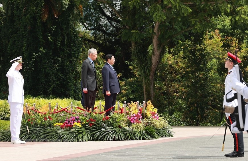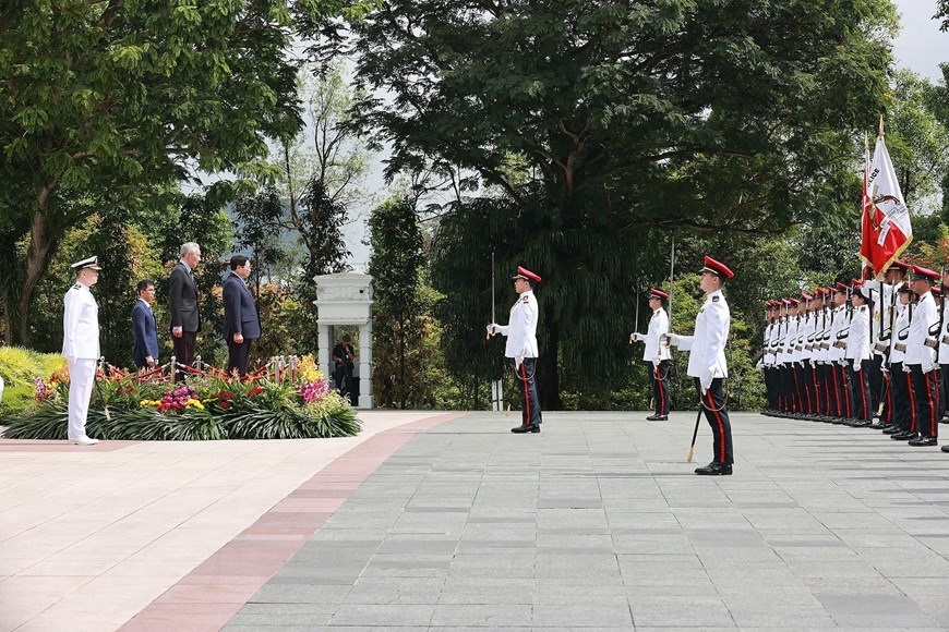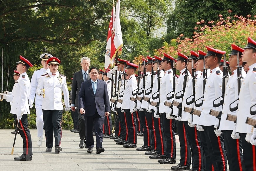 Thủ tướng Phạm Minh Chính và Thủ tướng Singapore Lý Hiển Long duyệt đội danh dự. (Ảnh: Dương Giang/TTXVN)