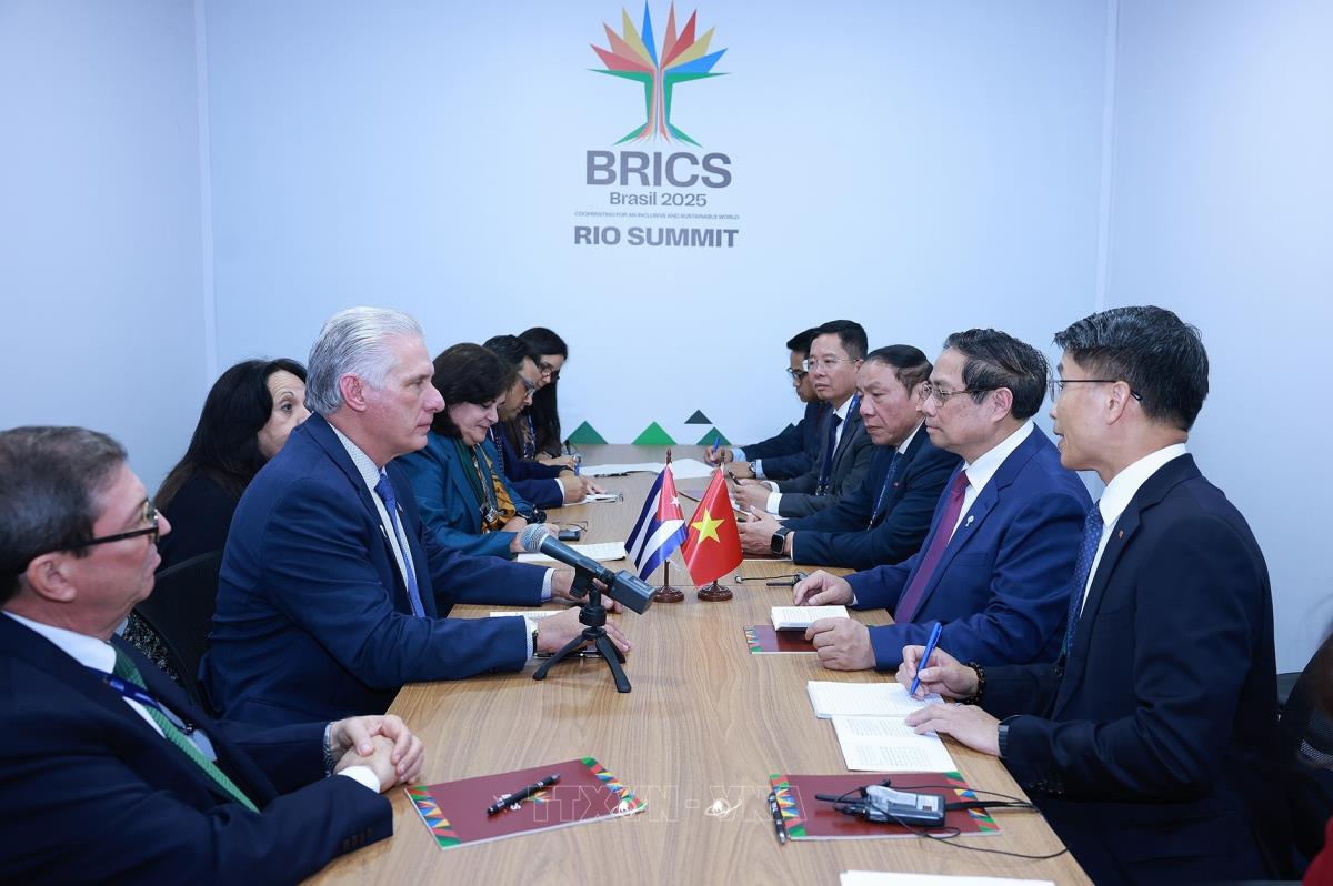 Hà Nội (TTXVN 7/7/2025) Theo đặc phái viên TTXVN, trong khuôn khổ dự Hội nghị Thượng đỉnh BRICS mở rộng tại thành phố Rio de Janeiro của Brazil, chiều 6/7 theo giờ địa phương, Thủ tướng Chính phủ Phạm Minh Chính đã hội kiến Bí thư thứ nhất, Chủ tịch nước Cuba Miguel Diaz Canel.