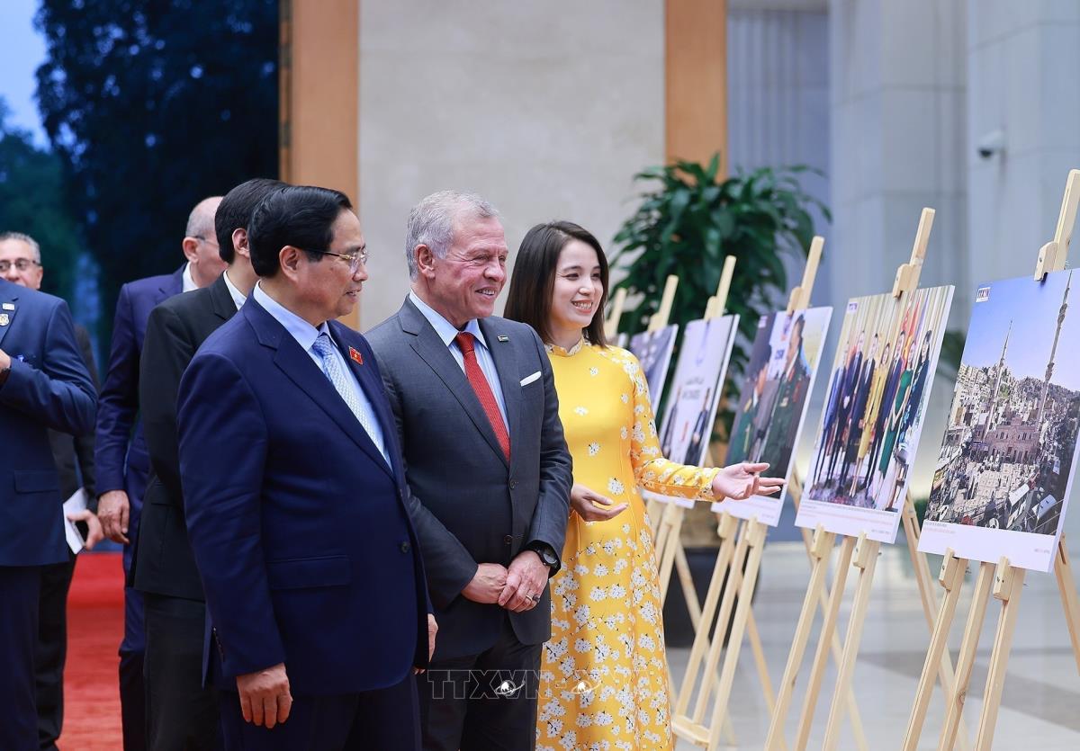Thủ tướng Phạm Minh Chính và Quốc vương Jordan Abdullah II bin Al Hussein tham quan trưng bày ảnh về quan hệ hợp tác giữa hai nước, do Thông tấn xã Việt Nam thực hiện (12/11/2025). Ảnh: Dương Giang-TTXVN