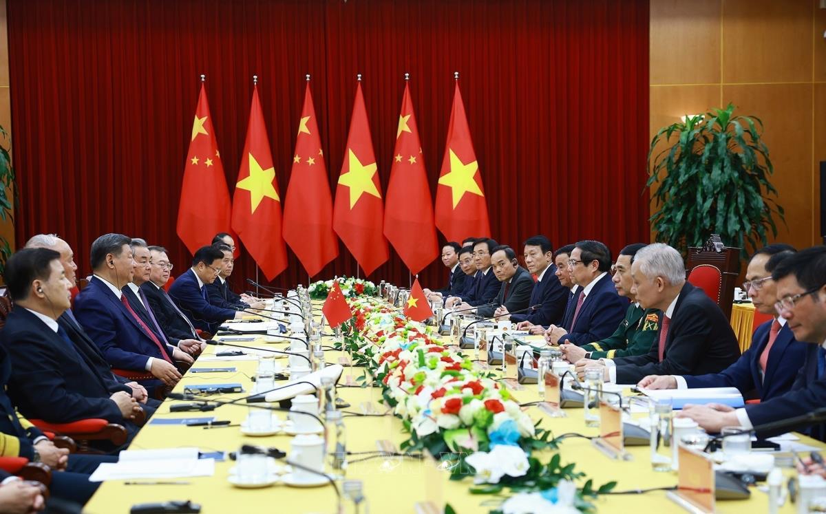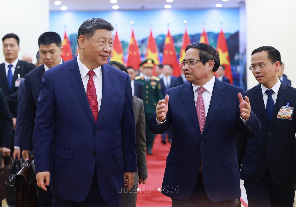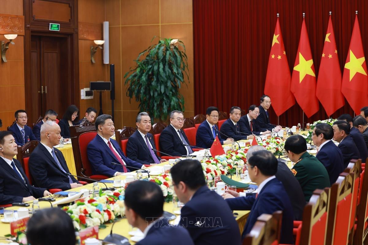 Hà Nội (TTXVN 14/4/2025) Chiều 14/4/2025, tại Trụ sở Trung ương Đảng, Thủ tướng Phạm Minh Chính hội kiến Tổng Bí thư, Chủ tịch nước Trung Quốc Tập Cận Bình thăm cấp Nhà nước tới Việt Nam.