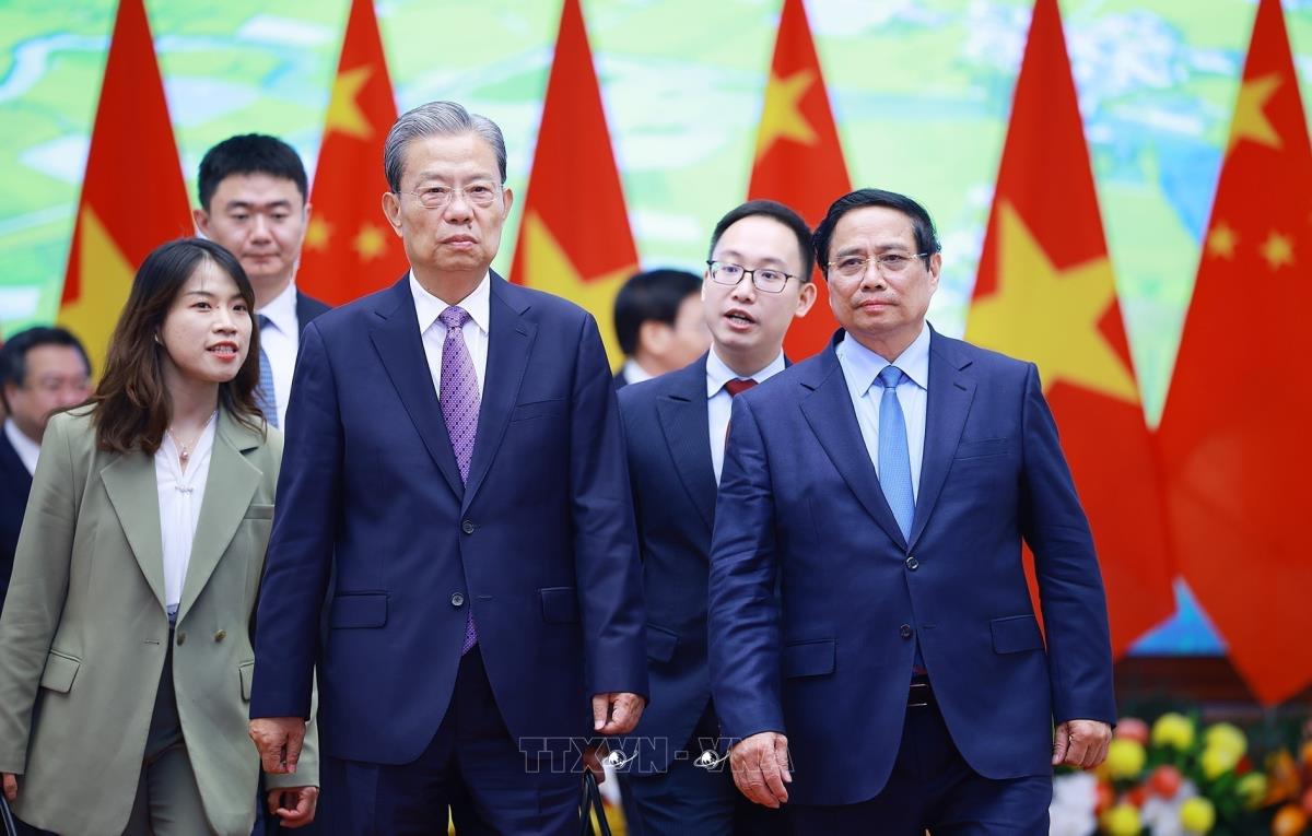 [Photo] Thủ tướng Phạm Minh Chính hội kiến Ủy viên trưởng Nhân đại toàn quốc Trung Quốc