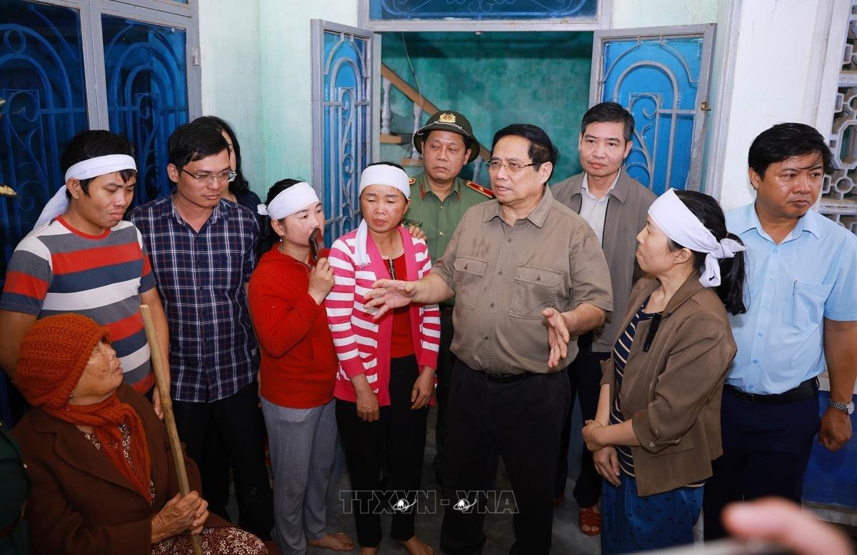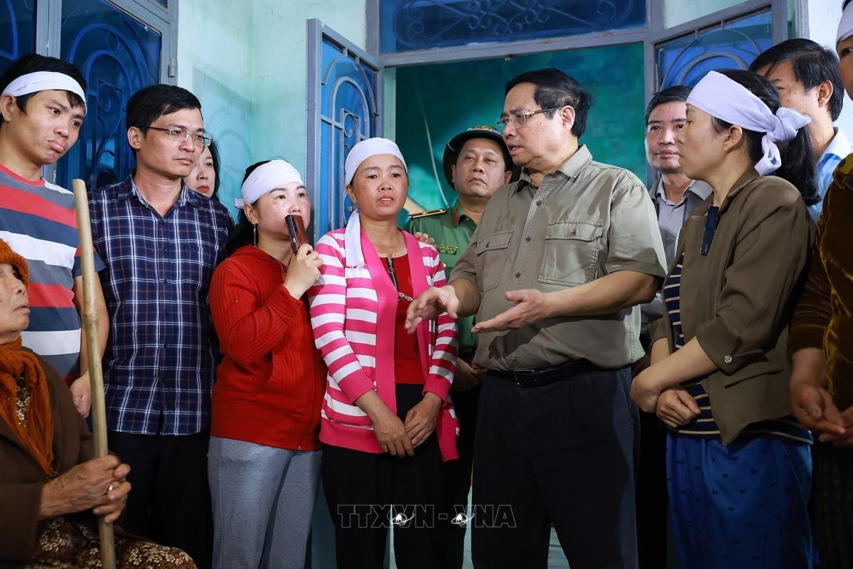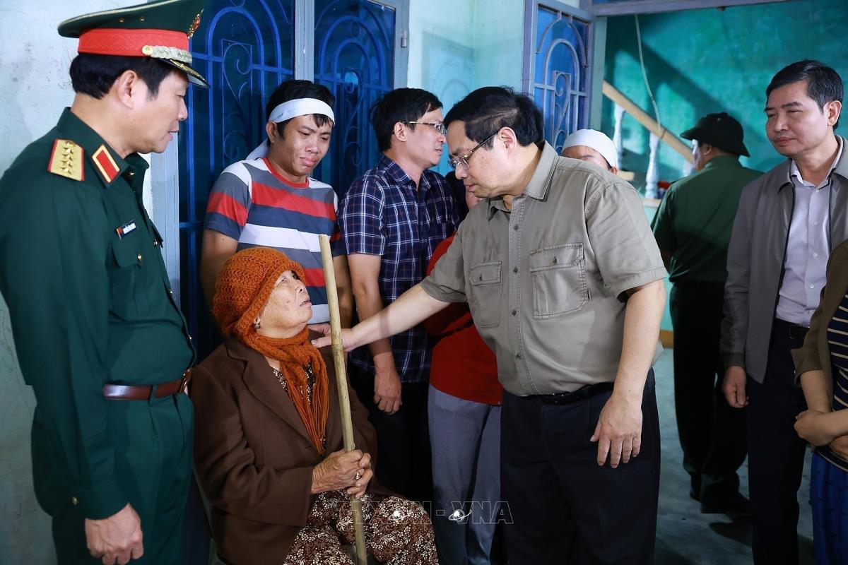 Thủ tướng Phạm Minh Chính thăm, động viên nhân dân vùng ảnh hưởng nặng nề của mưa lũ xã Hòa Thịnh (29/11/2025). Ảnh: Dương Giang-TTXVN